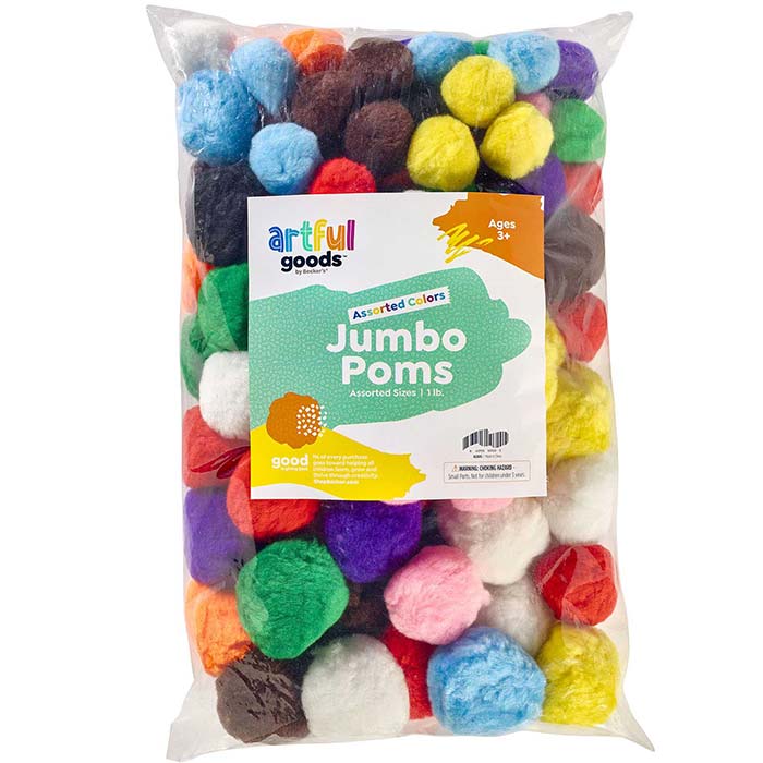 Young artists will have a terrific time turning Artful Goods® Jumbo Poms into seasonal crafts, pretend treats, fantastic figures, and more. Bright colors and fluffy textures keep children enthralled for hours. Generous 1 lb. size helps keep your classroom well-stocked.