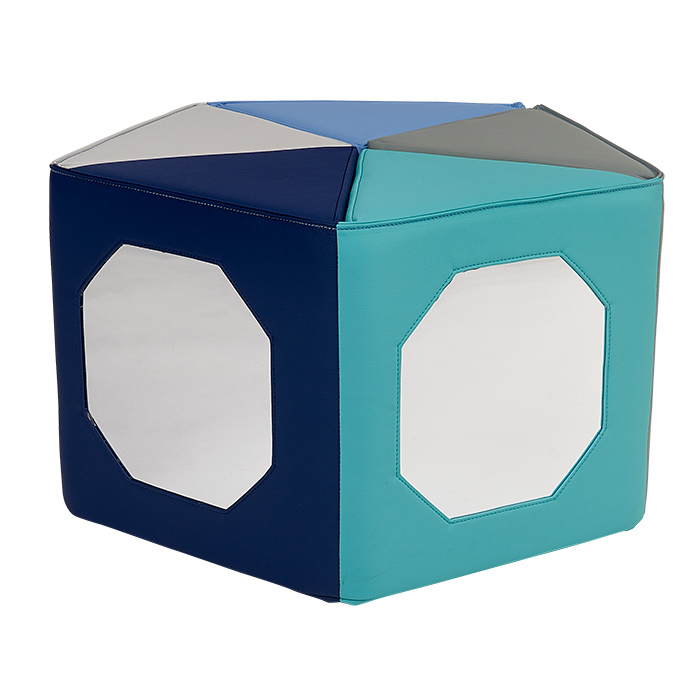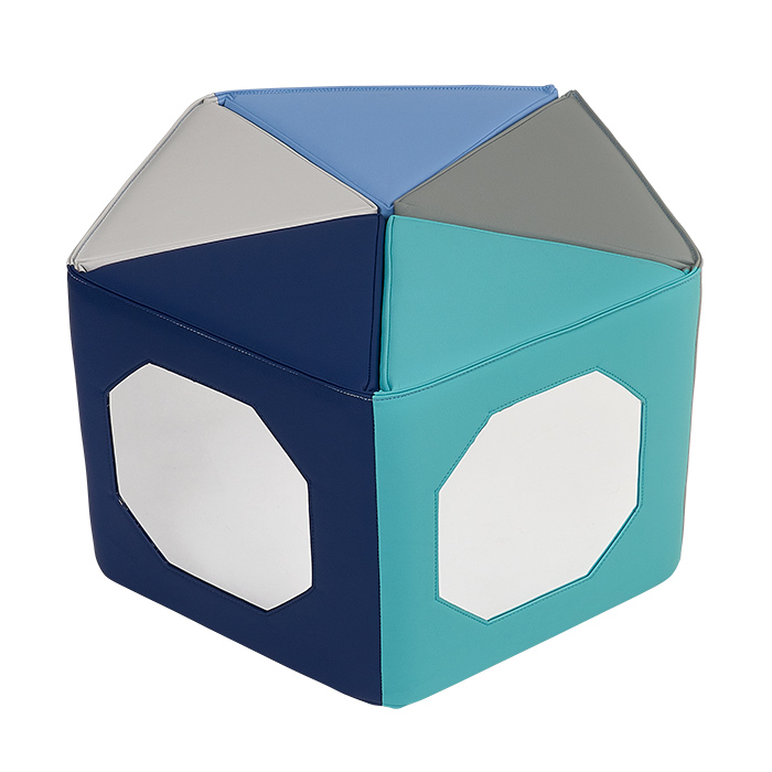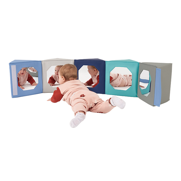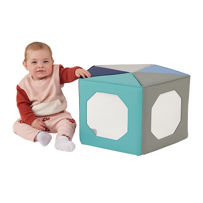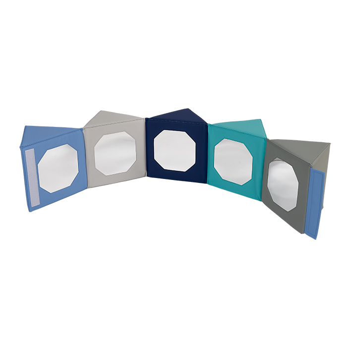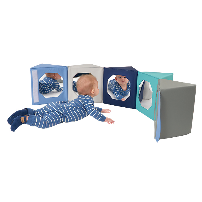 So many options for engaging with this mirrored pentagon, designed to captivate early crawlers. Unfold to reveal a collection of shatterproof acrylic mirrors arranged in a semi-circle, perfect for tummy-time exploration. Fold to transform to a soft pentagon just right for cruising. Mirrors encourage self-recognition, body awareness, and spatial understanding, all in a safe, engaging setting.