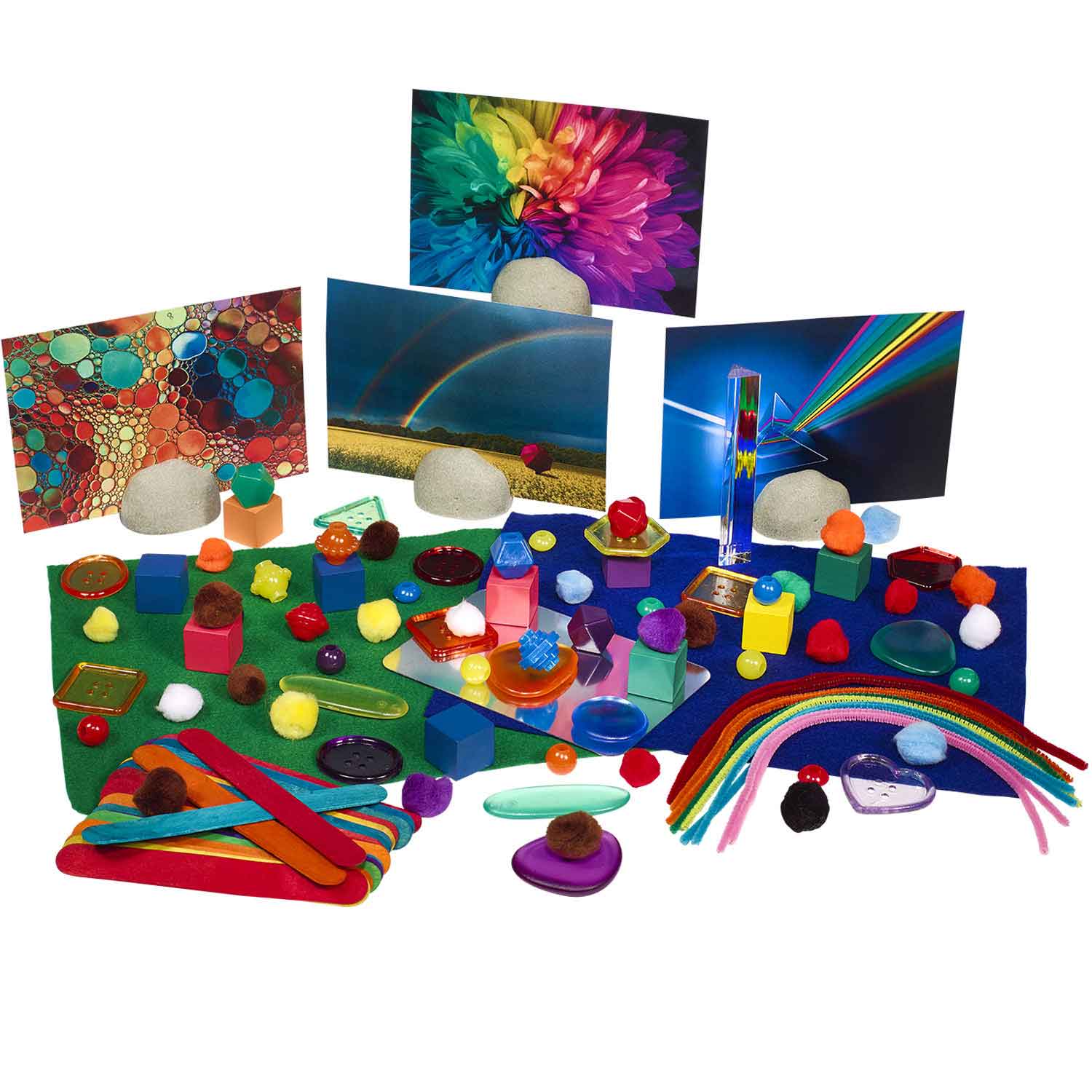 - Includes colored cubes, pom poms, a prism and mirror, translucent buttons, colorful beads and craft materials in a labeled storage tub