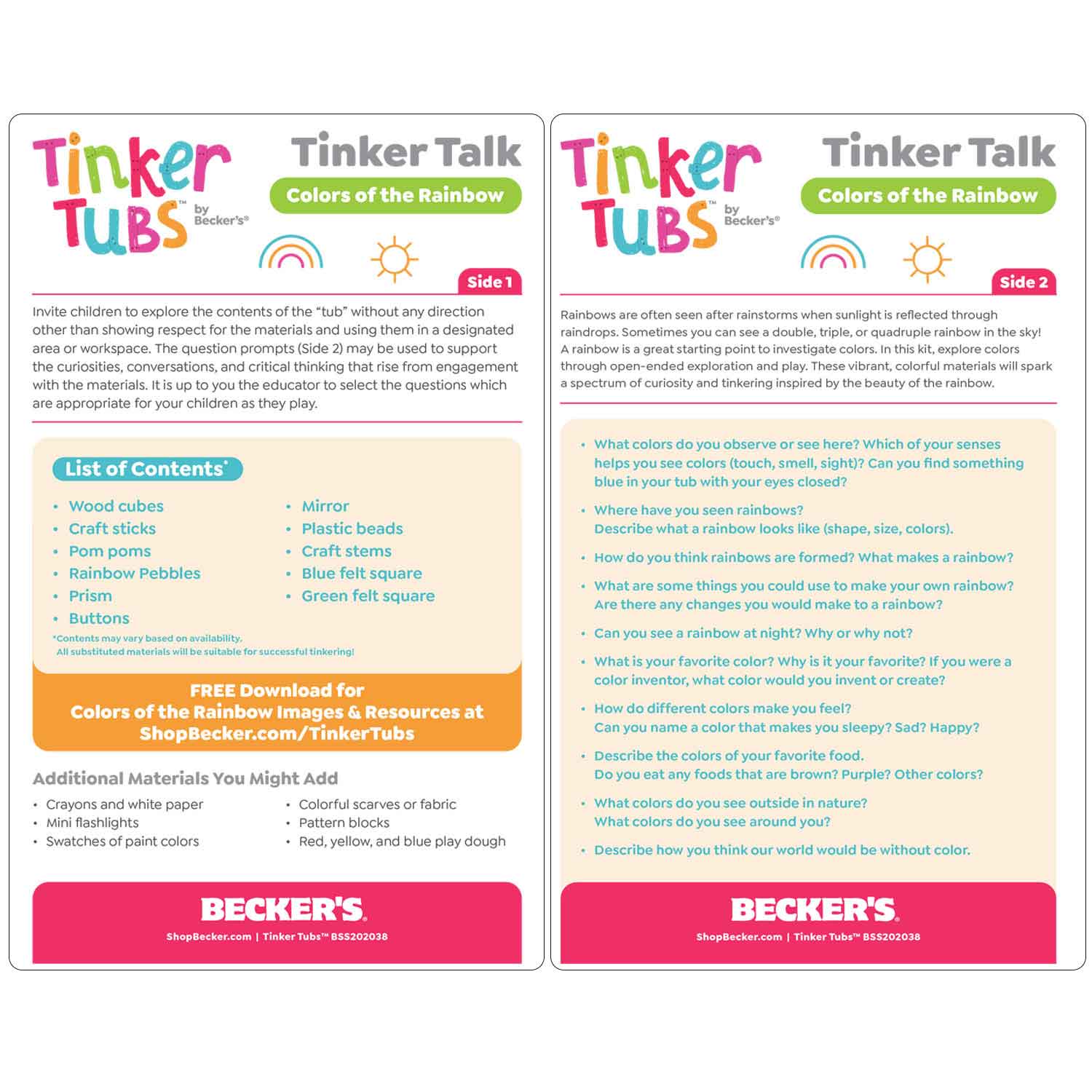 A rainbow is a great starting point to investigate colors. In this kit, explore colors through open-ended exploration and play. These vibrant, colorful materials will spark a spectrum of curiosity and tinkering inspired by the beauty of the rainbow. Tinker Tubs™ are creatively curated sets of materials that encourage active exploration and discovery. Becker's Colors of the Rainbow tub is an open invitation to create, design and problem solve with a variety of interesting materials. This tub includes colored cubes, pom poms, a prism and mirror, translucent buttons, colorful beads, craft materials, a Tinker Talk Card with higher order thinking prompts, and a FREE image download link in a labeled storage tub. The 2 felt pieces (9" x 12") can be used to define the play space. Sold individually and as part of the Tinker Tub Collection BSS202019.