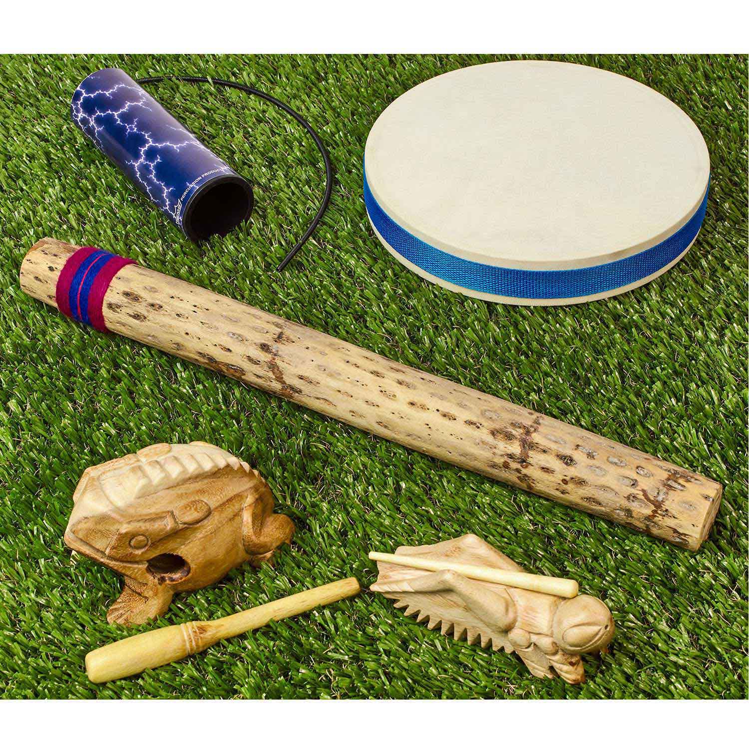 Awaken your senses to the sounds of nature with this set of uniquely crafted instruments made from manmade and natural materials. Includes rainstick, ocean drum, thunder tube, frog rasp and cricket rasp.