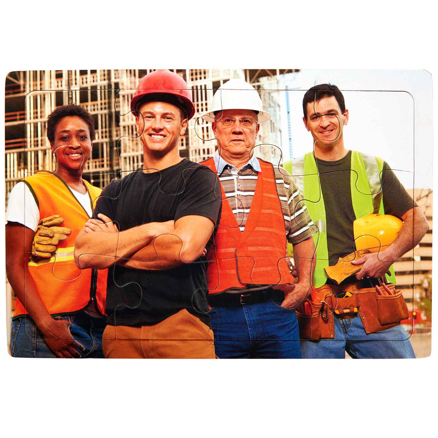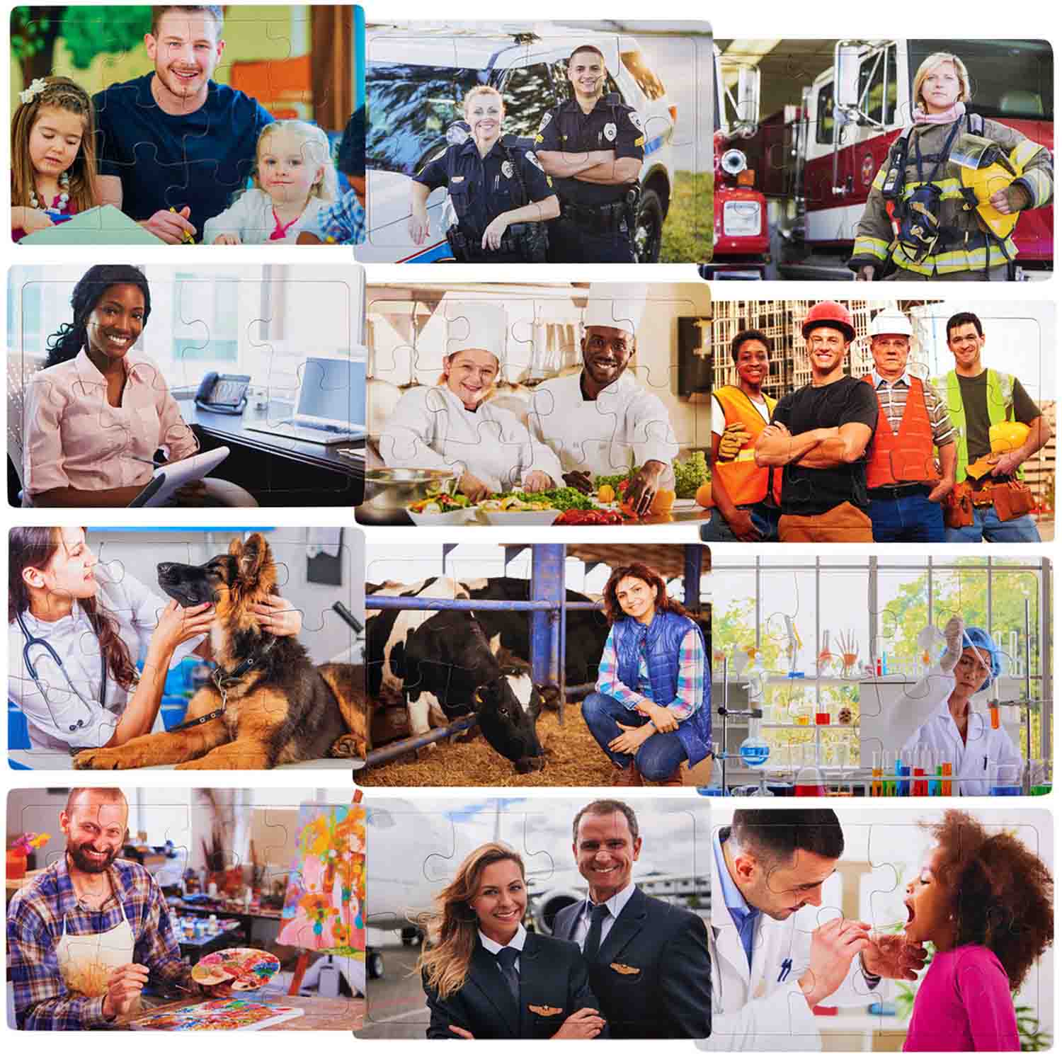 Let's talk about the jobs that people do! Invite children to describe what they see in each photo. Find workers with uniforms and tools. Talk about indoor and outdoor work and what skills are needed to do each job. Puzzles have 8 or 12 pieces and matching images for children who need visual clues.