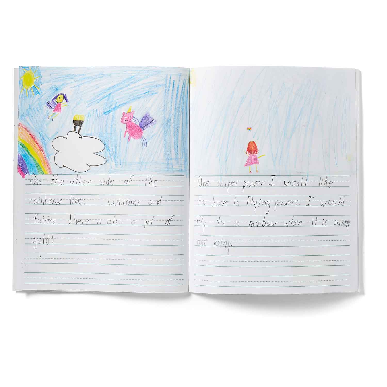 Paper and cover stock accepts all media like pencil, marker, crayon, pastels, and water color. 48 pages with covers. Storybook Ruled 2nd Primary. Download Journal Prompts.