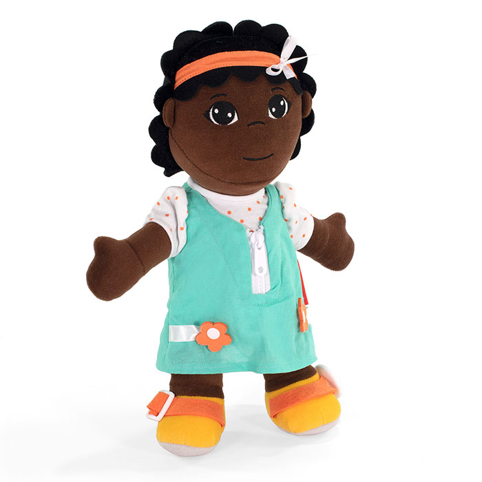 Children learn to dress and undress through playing with these multicultural dolls: fastening buttons, zippers, snaps, shoe laces and buckles.