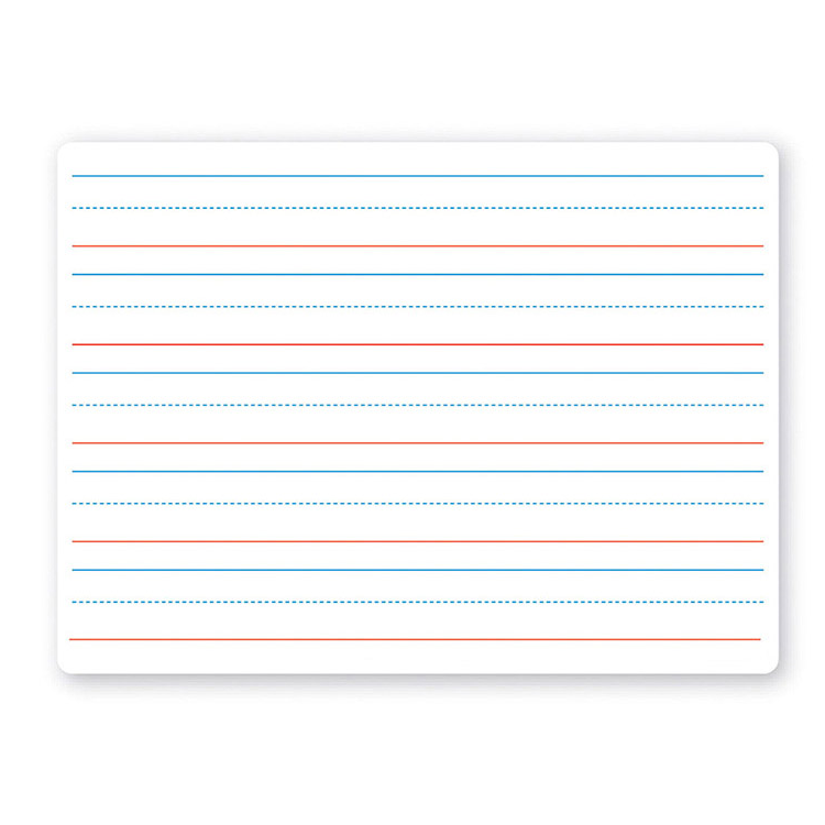 Red and blue ruled lines on one side, plain on back side. Line sets are 1 1/8" with 3/8" space below. Dry-erase.