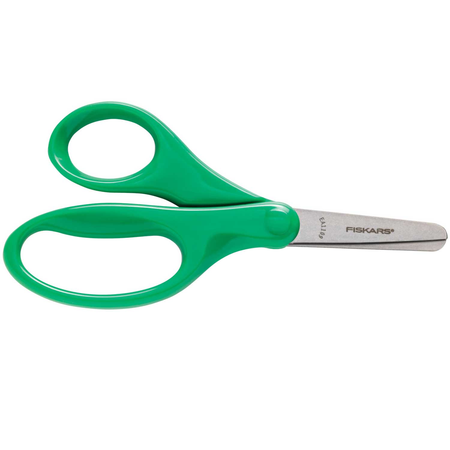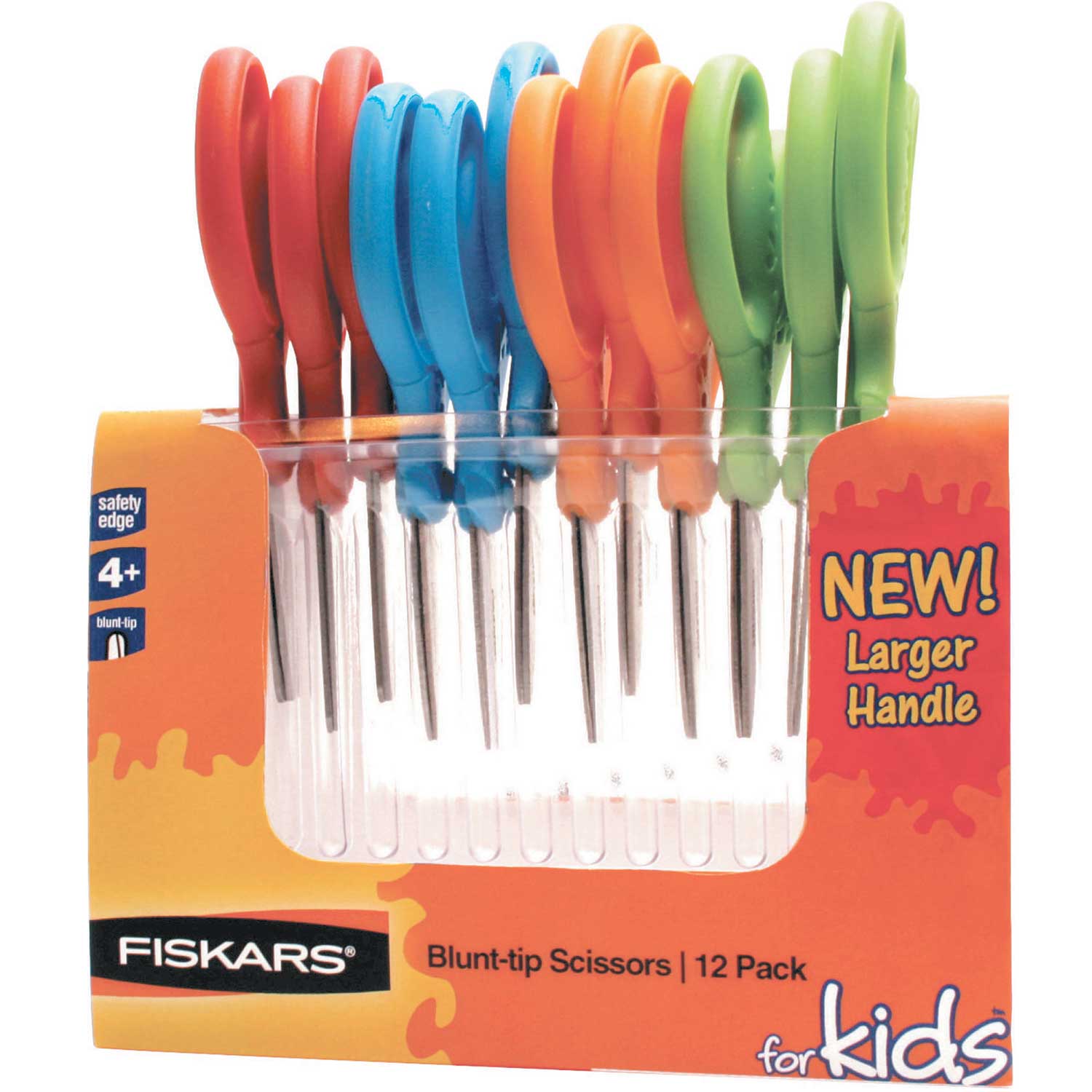 Stock up on the scissors preferred by kids! 12 Blunt-Tip Fiskars kids scissors with reusable scissor rack. Children love these Blunt-tip Kids Scissors for the redesigned handle that’s shiny, bright and smooth, not “sticky” or “bumpy." High-quality, compact 5" scissors with universal plastic handles for right or left-handed use.