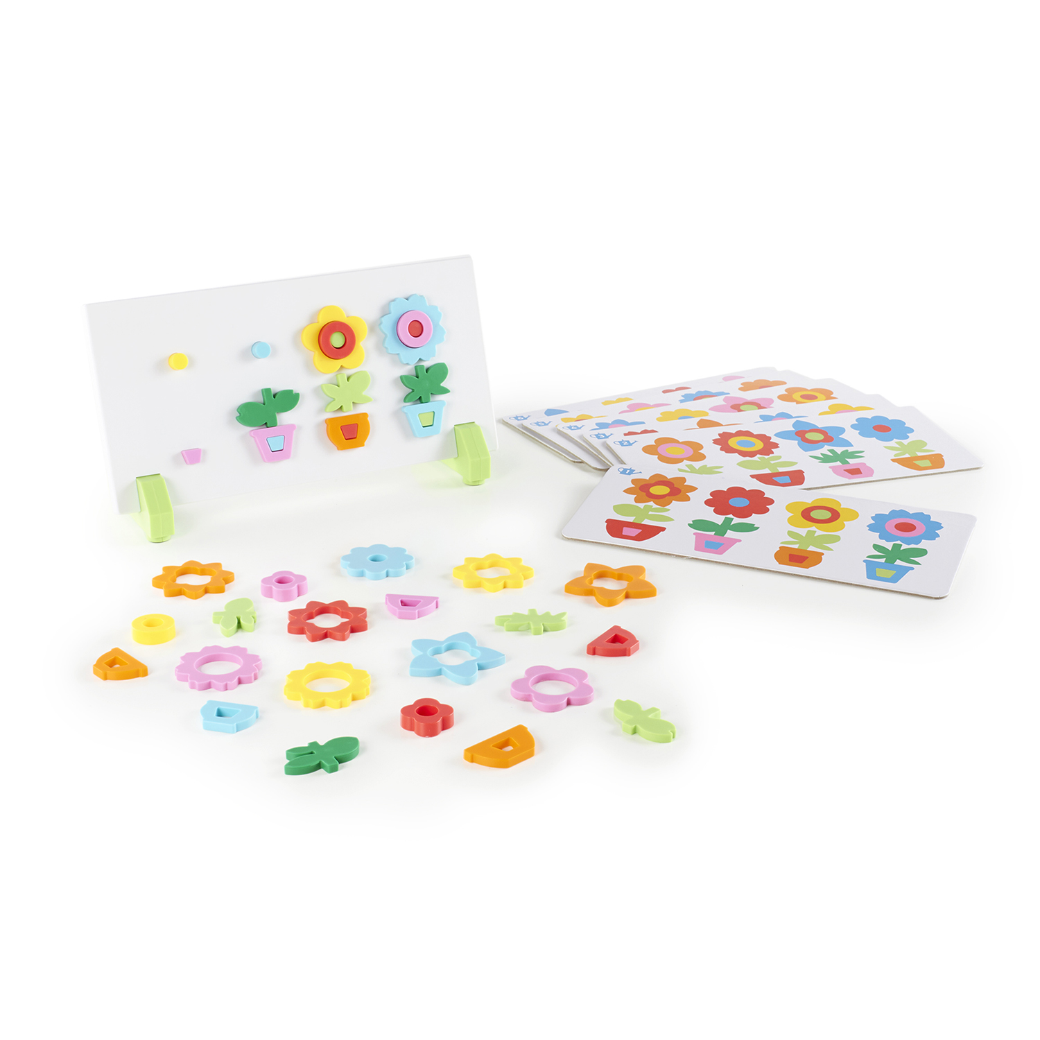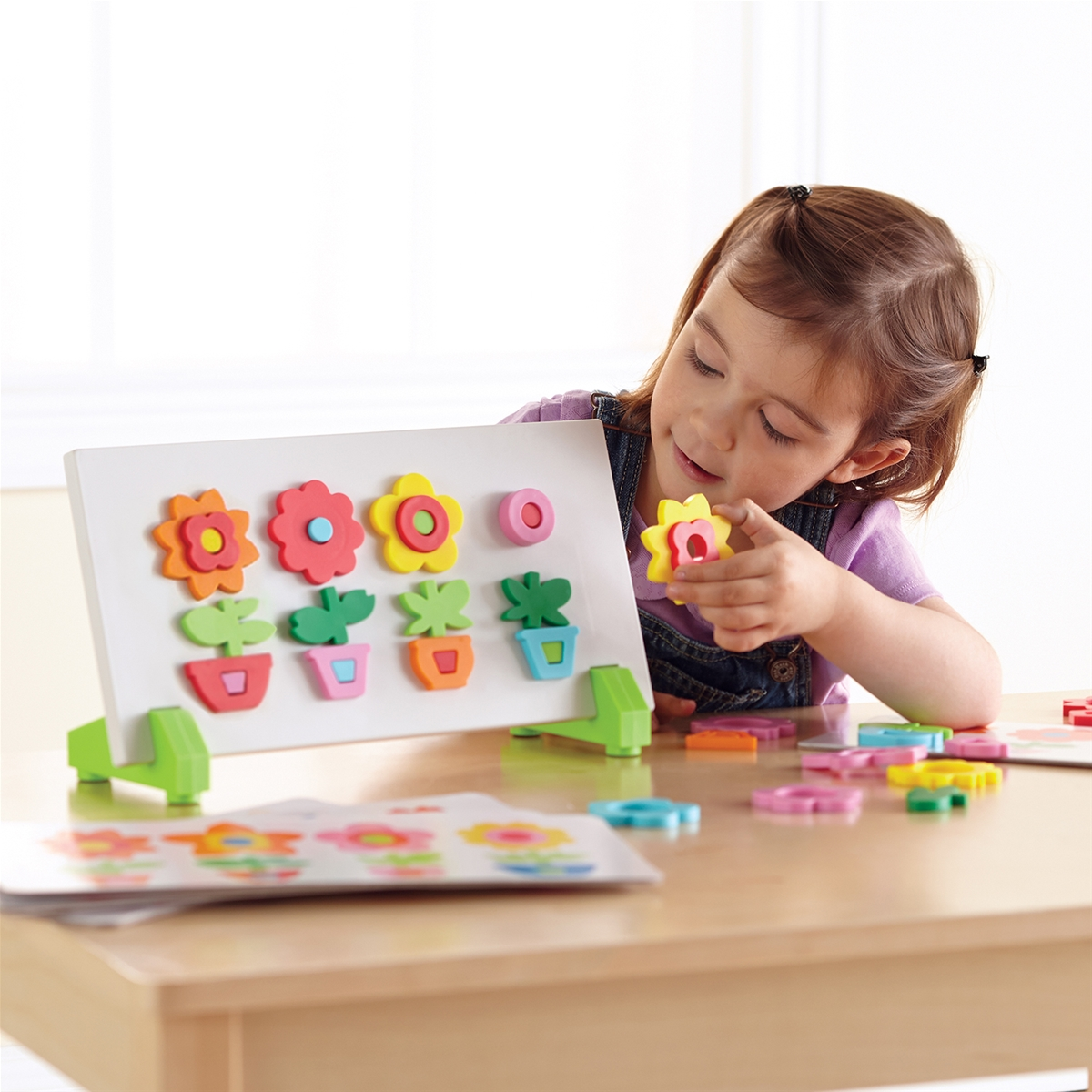 Kids will love playing in our garden as they match flower petals and stems as the perfect way to teach color and shape matching, sorting, sequencing, and pattern-recognition in a fun, game-like setting. Heavy-duty pieces with embedded magnets attach to the self-propping board that has pegs and a metal backing to help guide the parts into place. Includes (6) double-sided laminated pattern cards, washable flower pieces, and a durable birch plywood storage case