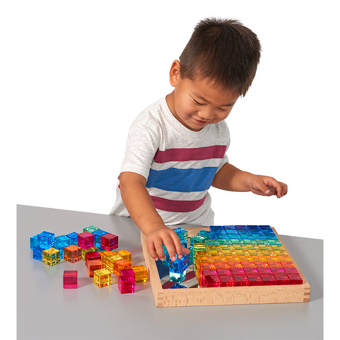 The Gem Cube Mirror Tray Set features 100 translucent acrylic cubes in 10 colors. Perfect for color recognition, patterning, and sequencing activities. The wooden mirror base adds sensory stimulation and reflection exploration. Ideal for color mixing, small world play and early math practice.