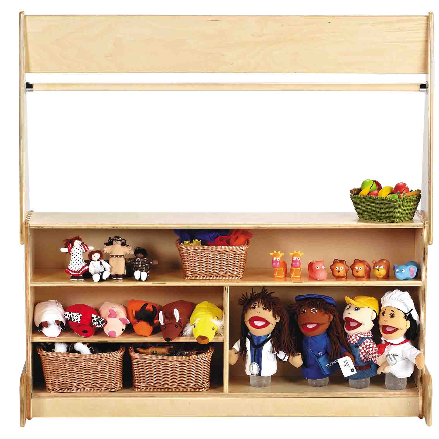 A stage, a store, a drive-up window-this Imagination Station has it all for your puppet theater needs! Shelves for puppet storage. Write-n-Wipe or Flannel fronts. Curtain rods included, optional curtains sold separately.