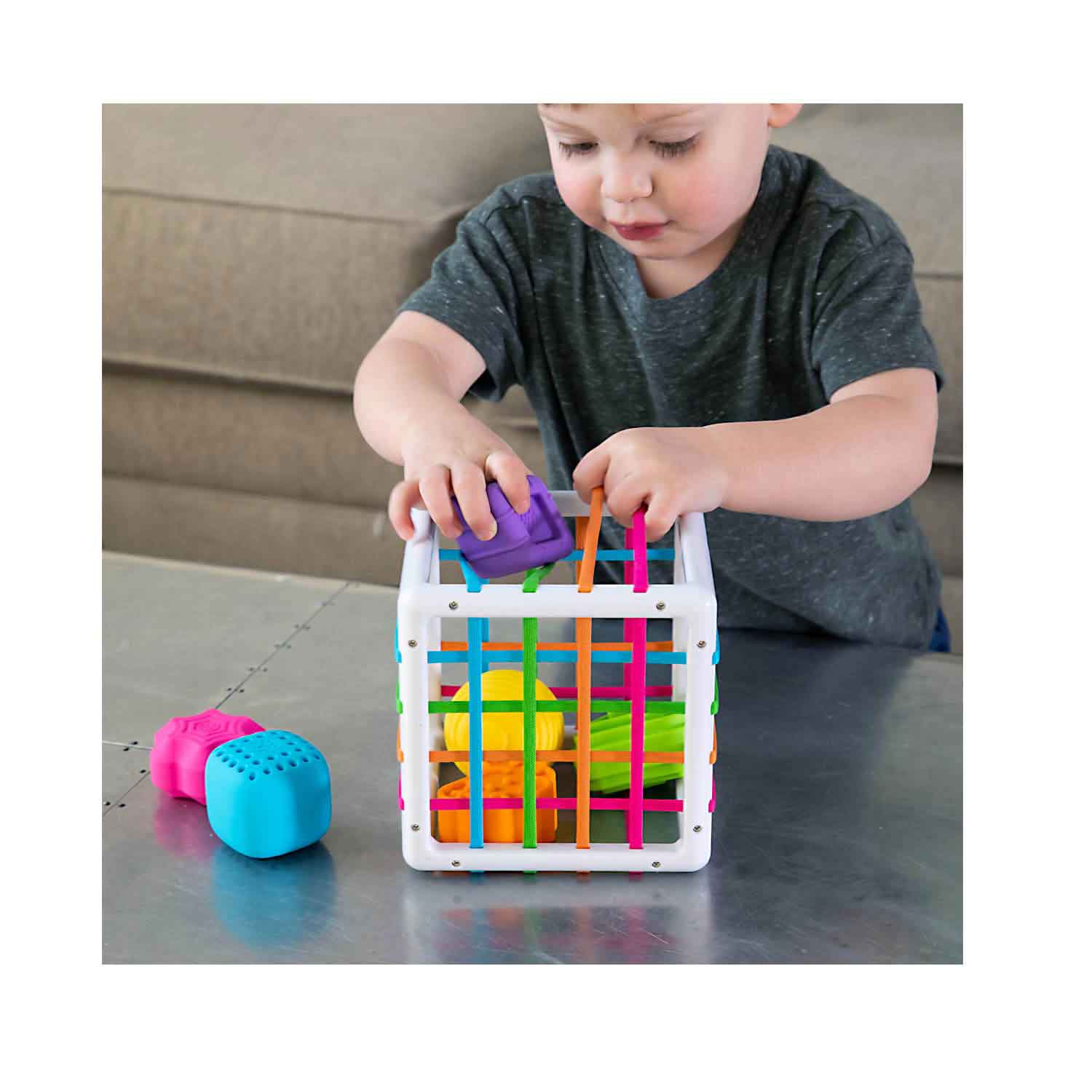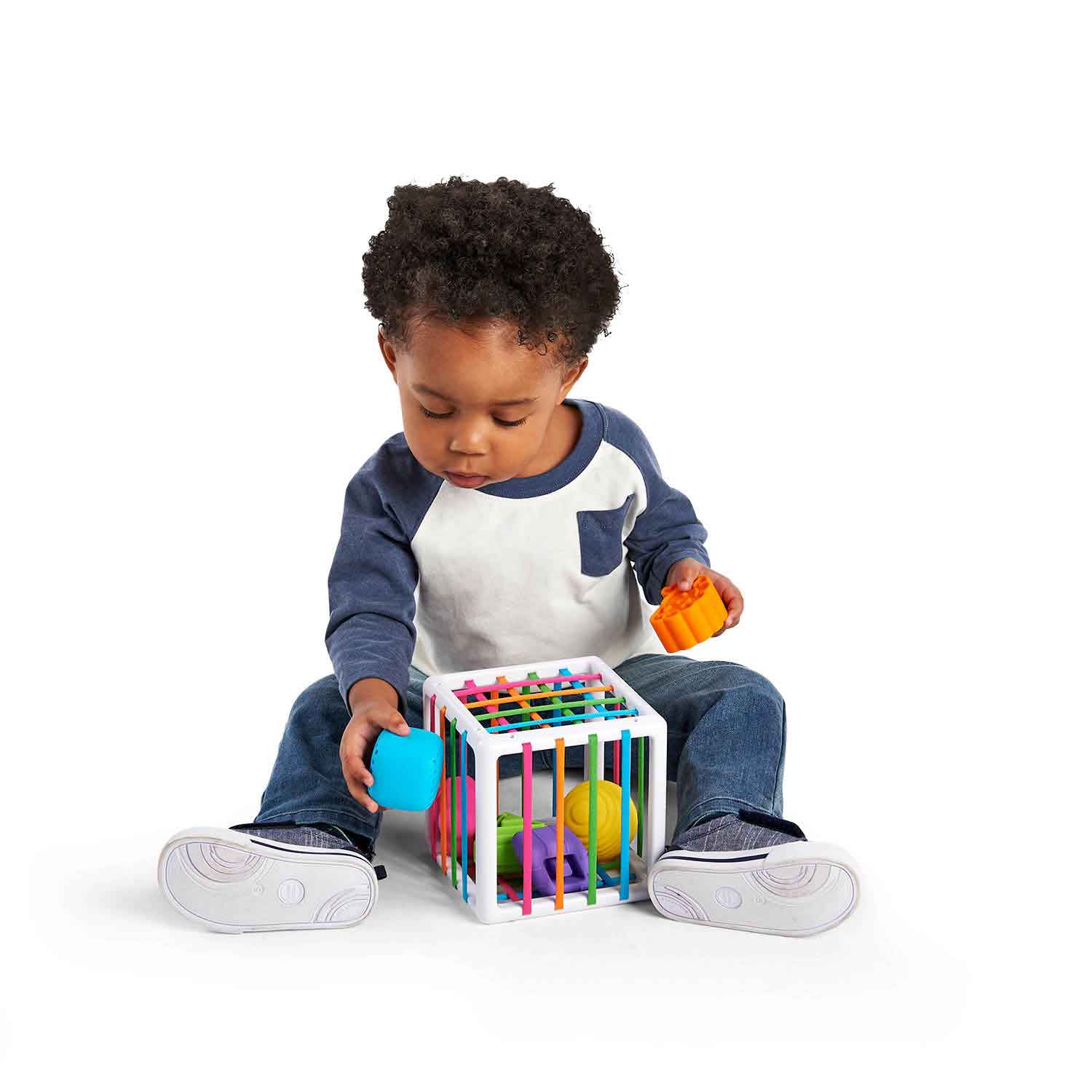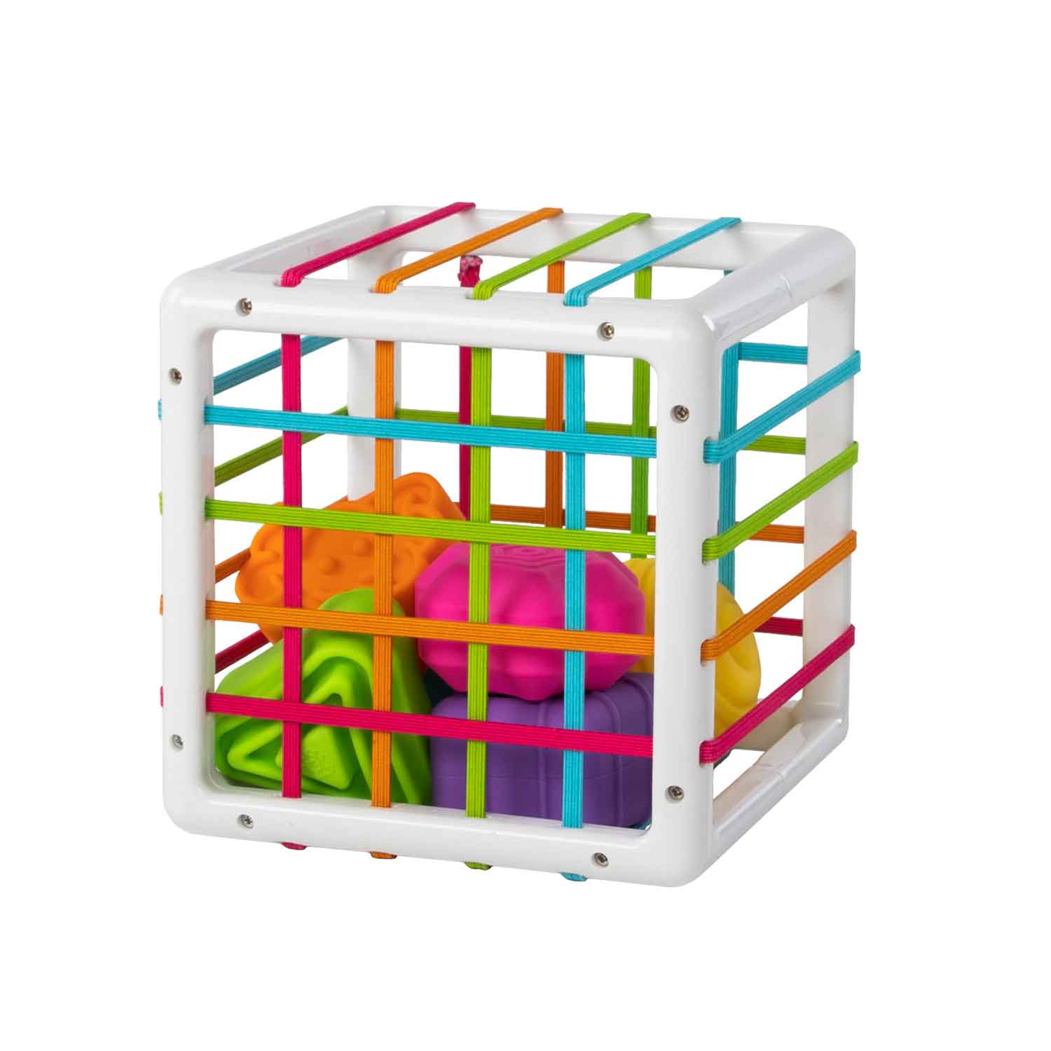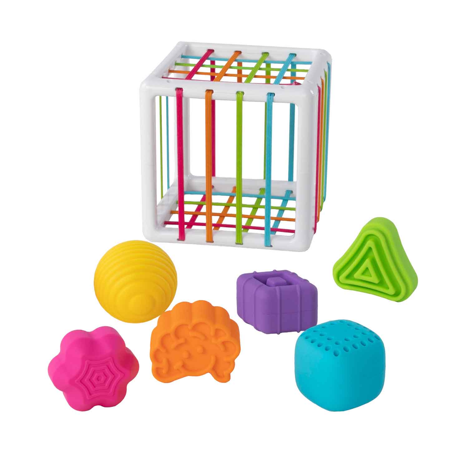 Creative design helps baby successfully push all six textured shapes into the cube through elastic bands.