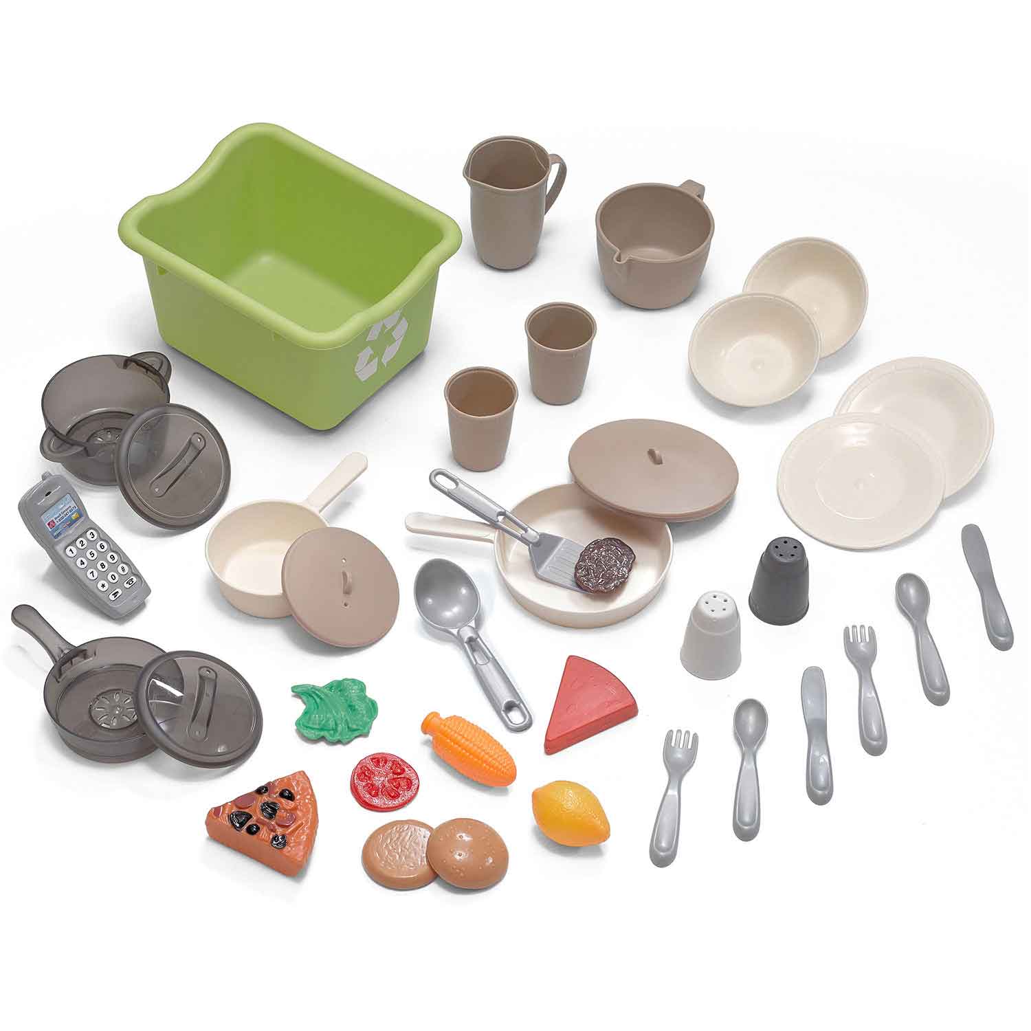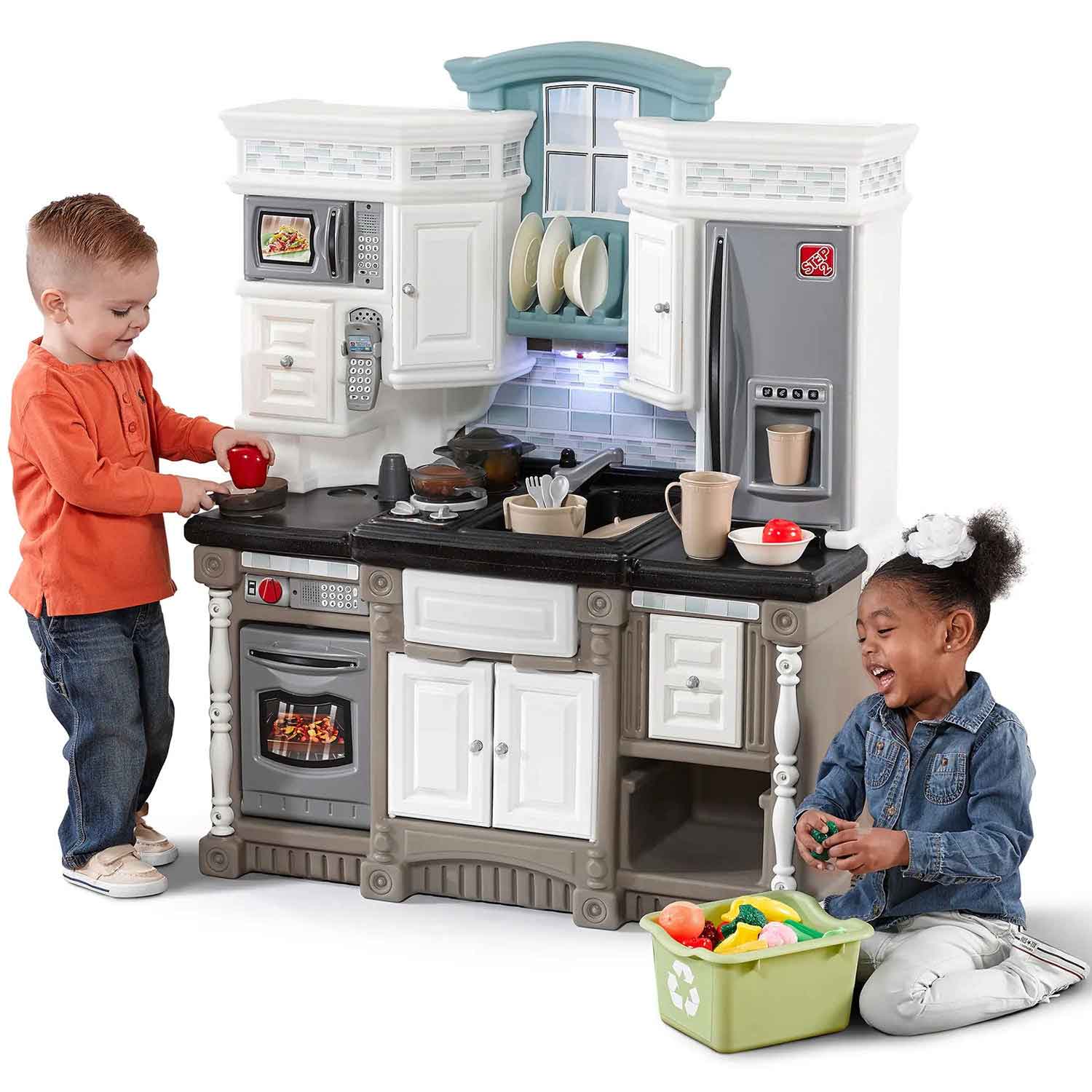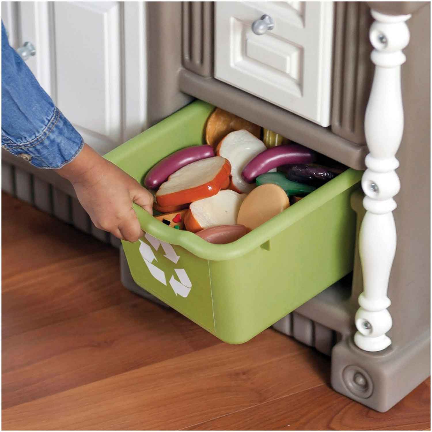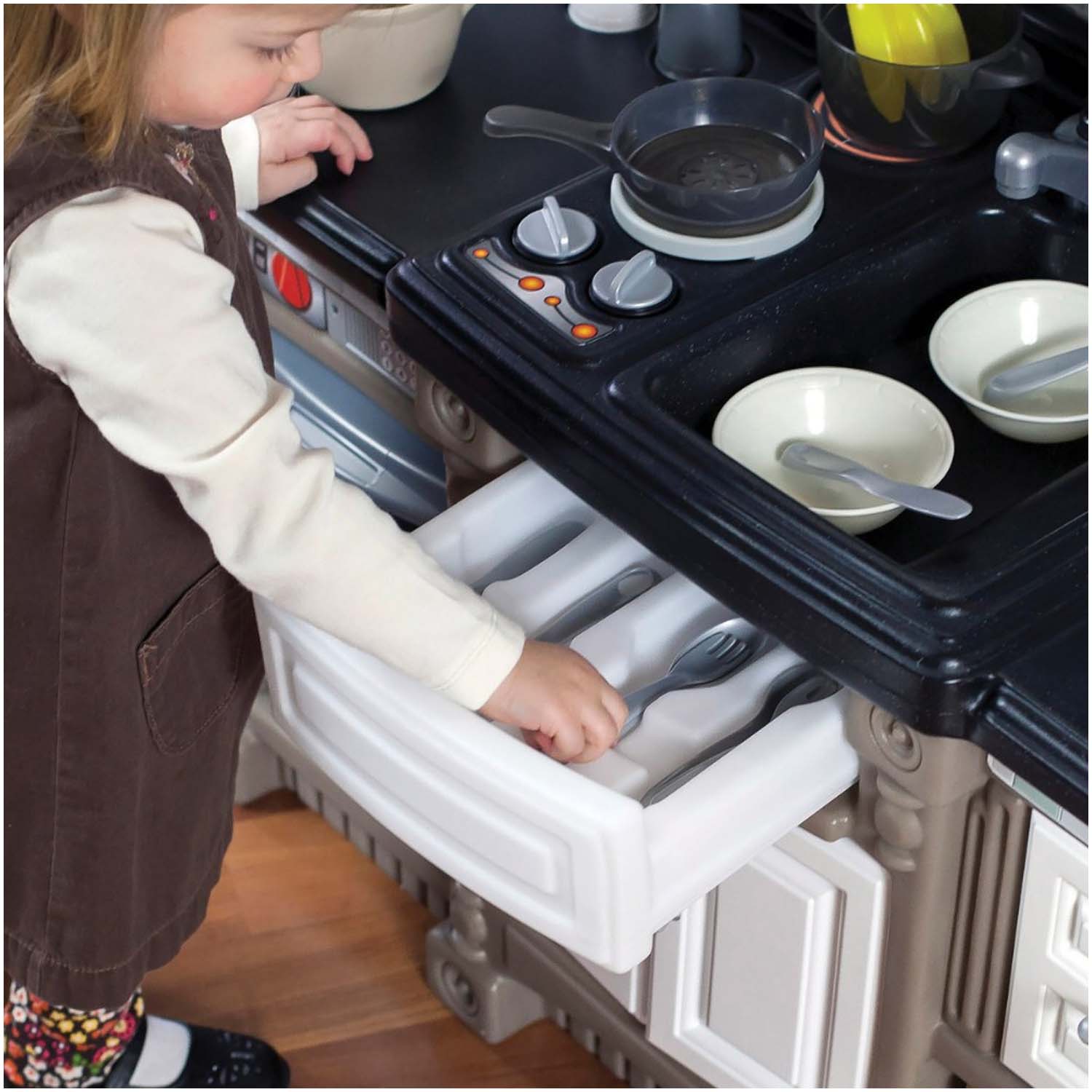 This roomy play kitchen includes cupboards, cabinets, pull-out drawers and bins that will neatly store all your kitchen accessories. Features include an electronic stove burner with lights and sound, and a fridge door with a molded-in pretend water dispenser. Pull-out silverware drawer keeps forks, spoons and knives neatly organized.