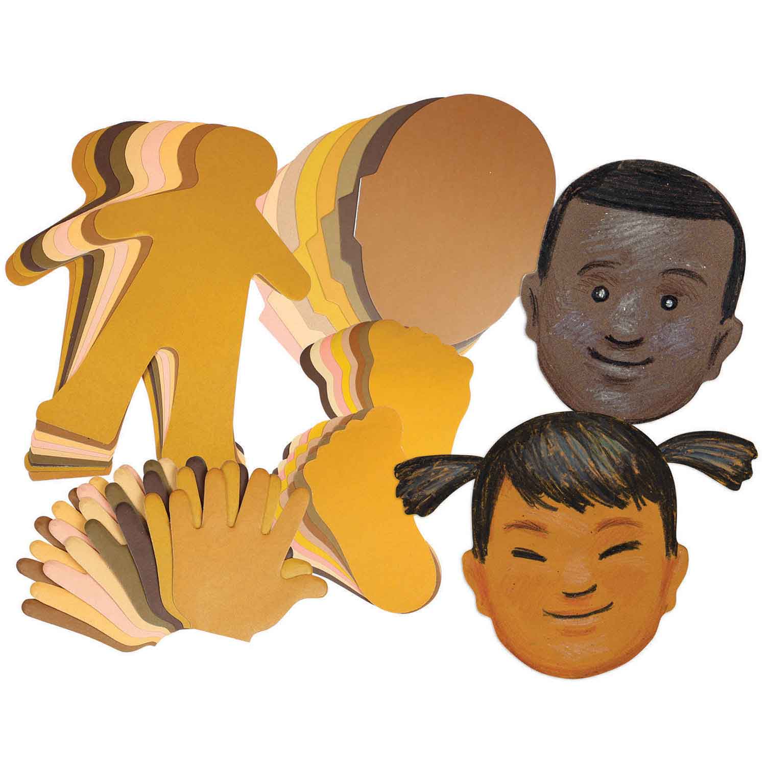 This value set of shapes made from lightweight paper Includes 40 full bodies, comes in handy for a variety of “All About Me” activities. 50 faces, 35 hands and 35 feet cut from 8 different skin tone papers.