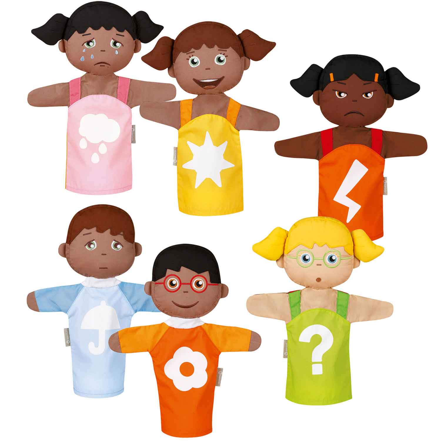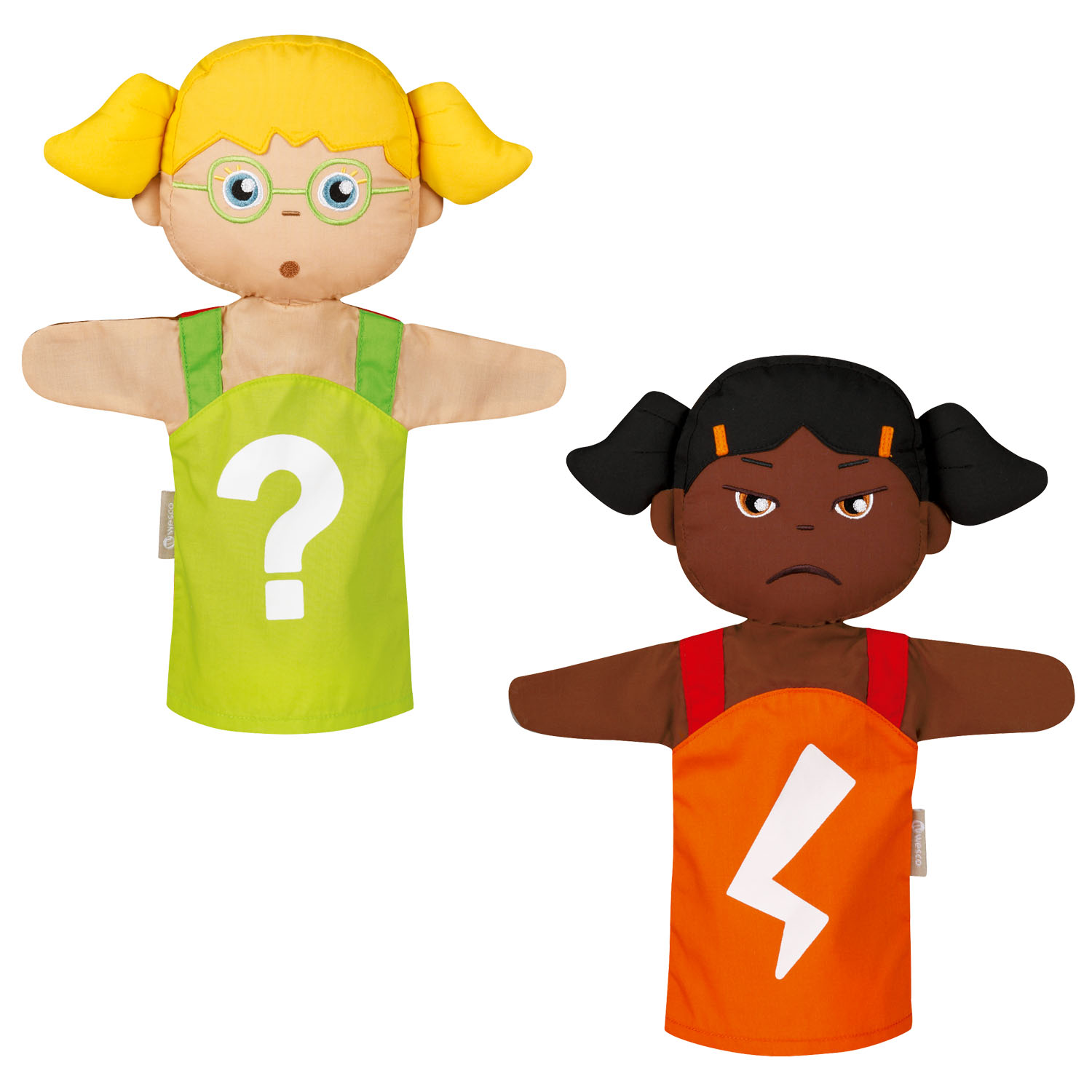 How do you feel? Flip the puppets to see different expressions: fear/surprise; happy/sad; anger/joy. Use for language and social/emotional activities.