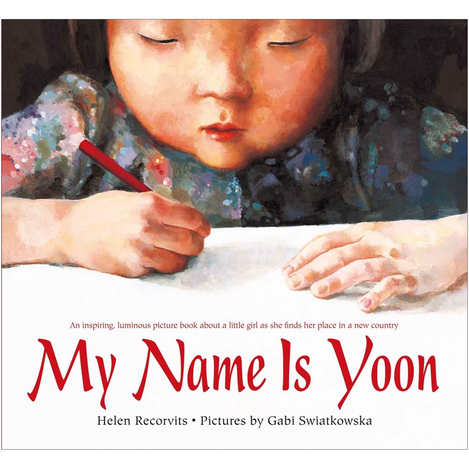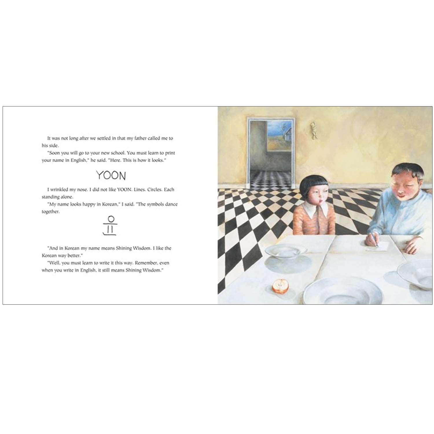 Yoon's name means "shining wisdom," and when she writes it in Korean, it looks happy, like dancing figures. But her father tells her that she must learn to write it in English. In English, all the lines and circles stand alone, which is just how Yoon feels in the United States. Yoon isn't sure that she wants to be YOON. At her new school, she tries out different names - maybe CAT or BIRD. Maybe CUPCAKE!