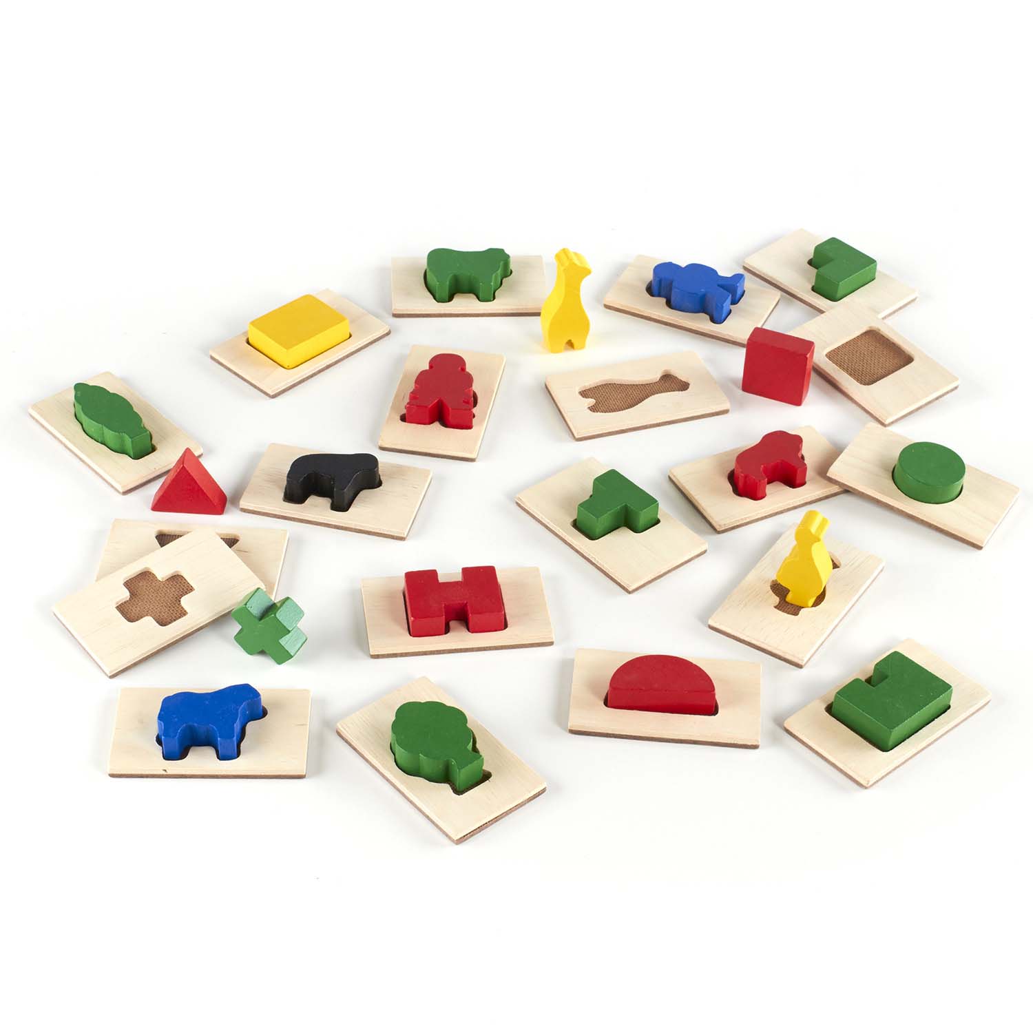 Children will use visual and tactile skills to feel and find these matching shapes. Includes 22 colorful wooden shapes with 22 matching tiles and drawstring bag. The wooden box features write-on/wipe-off board on top, solid wood bottom.