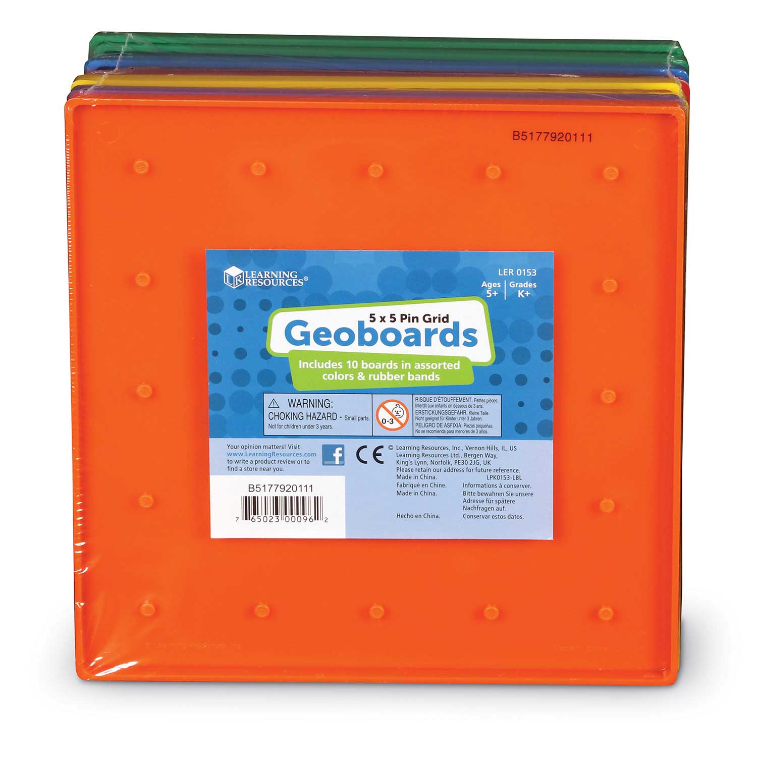 This classpack contains sturdy geoboards with a 5 x 5 pin grid and raised edges to protect the knobbed pegs.