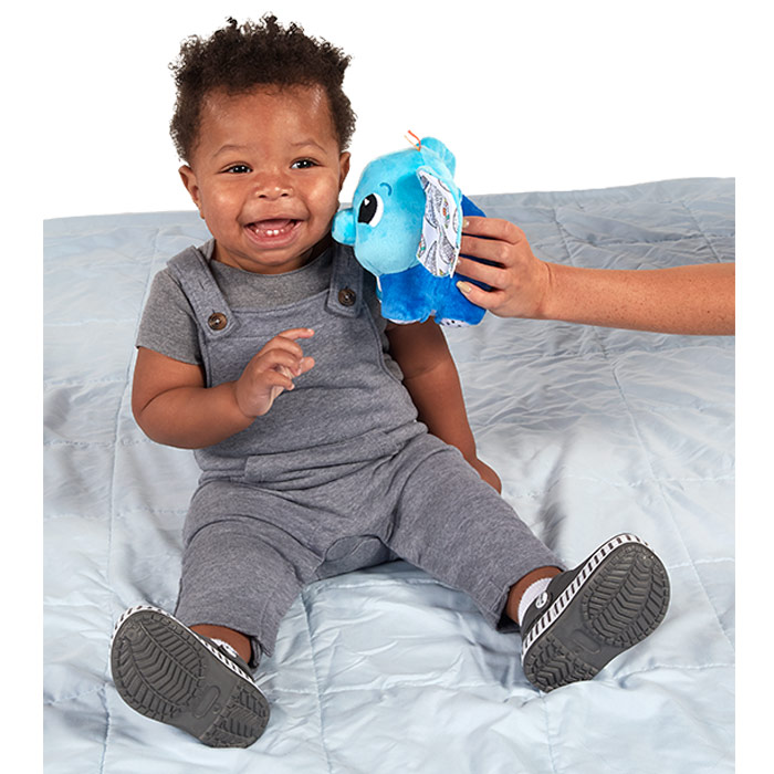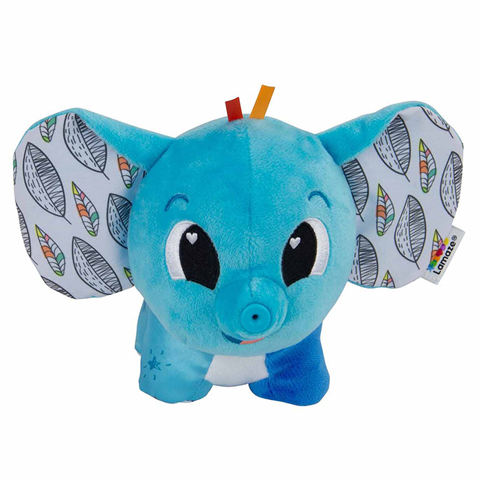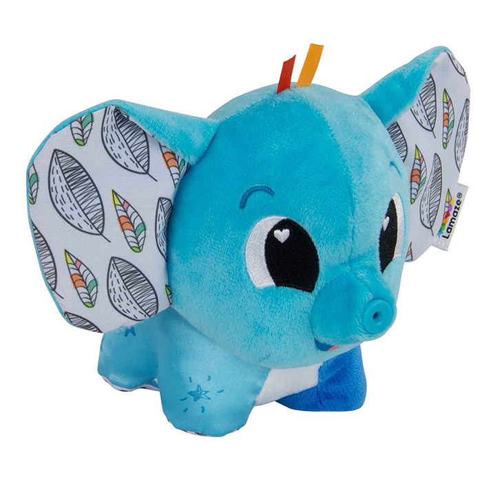 This plush elephant squeaks and blows a puff of air to help calm and soothe Crinkly ears add another sensory element.