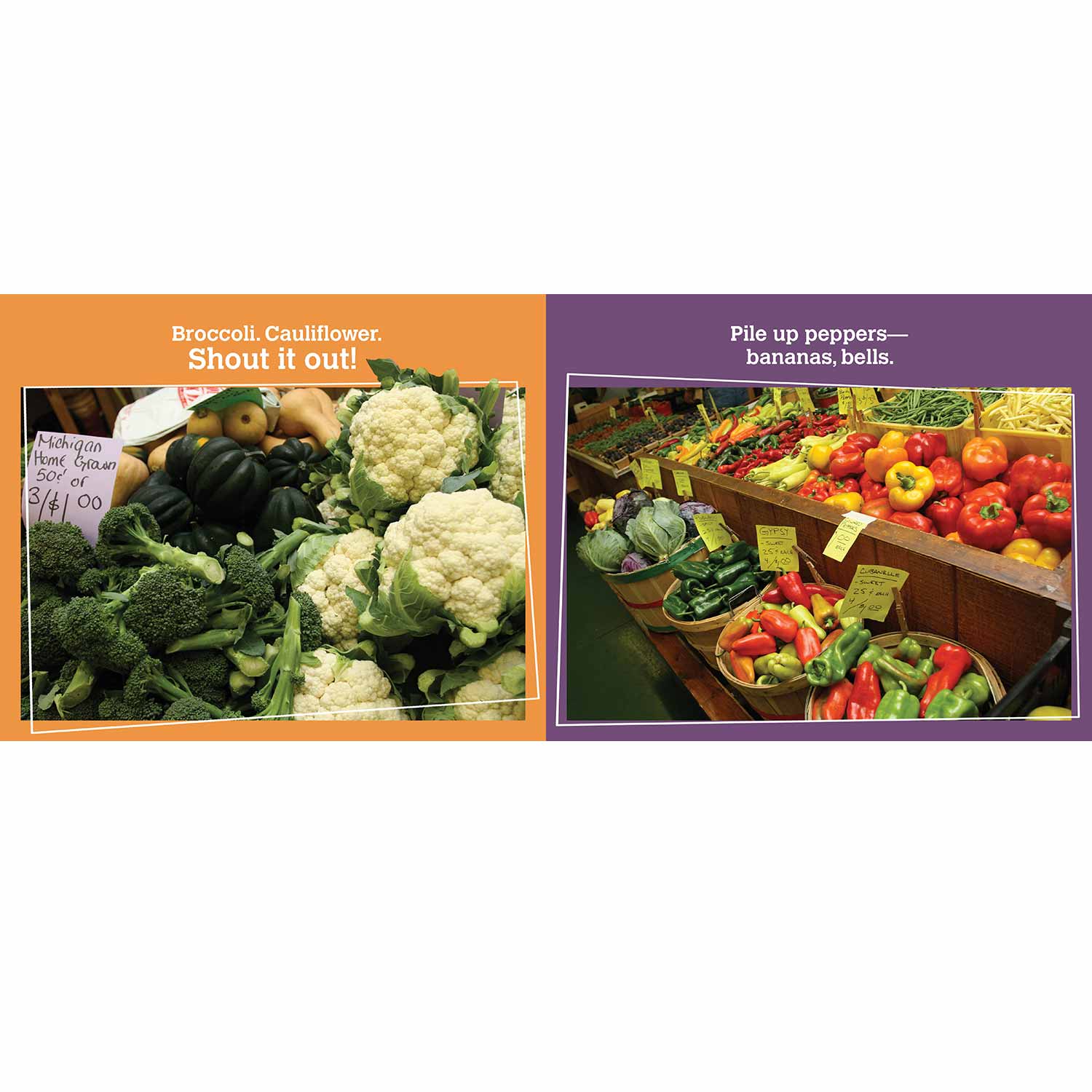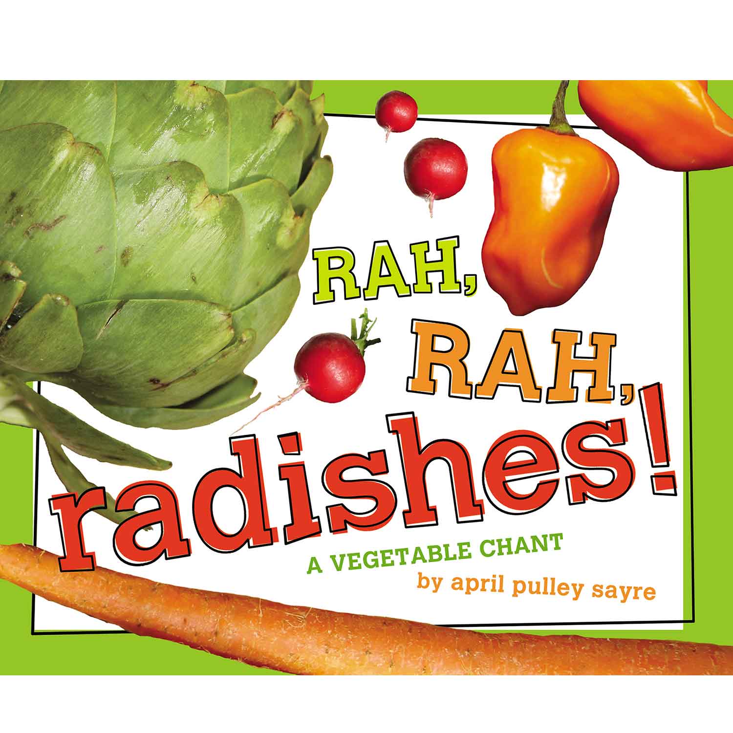 Rah Rah Radishes takes us on a rhyming, rollicking tour through a farmer’s market past every vegetable you can think of and then some. This book has eye-popping, taste-awakening images of each vegetable in its raw state. And if that’s not enough to wake up the senses, it’s read like a chant so that your ears and body get to join in on the fun. Who won’t stand up and cheer when you hear the first lines? . . .Rah, rah, radishes, red and white; Carrots are calling, Take a bite! Oh boy, bok choy, Brussels sprout; Broccoli. Cauliflower, Shout it Out!