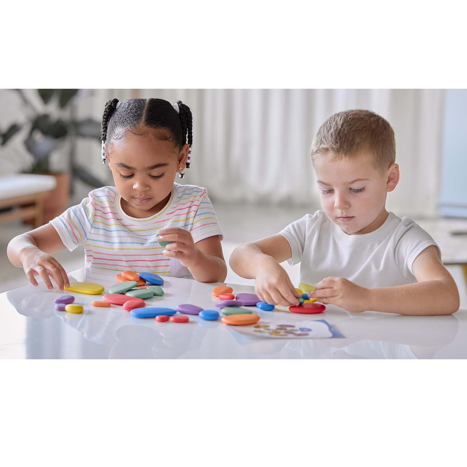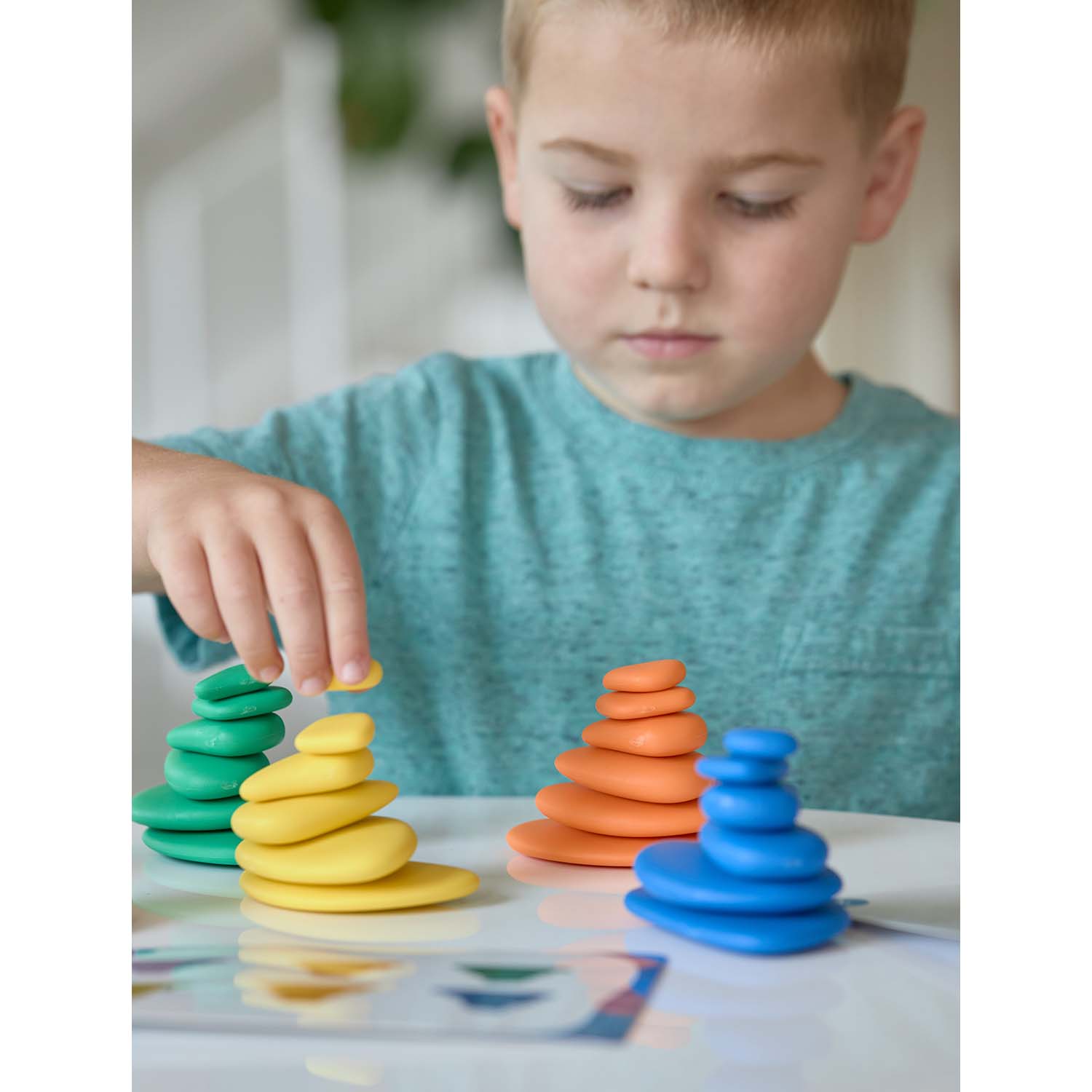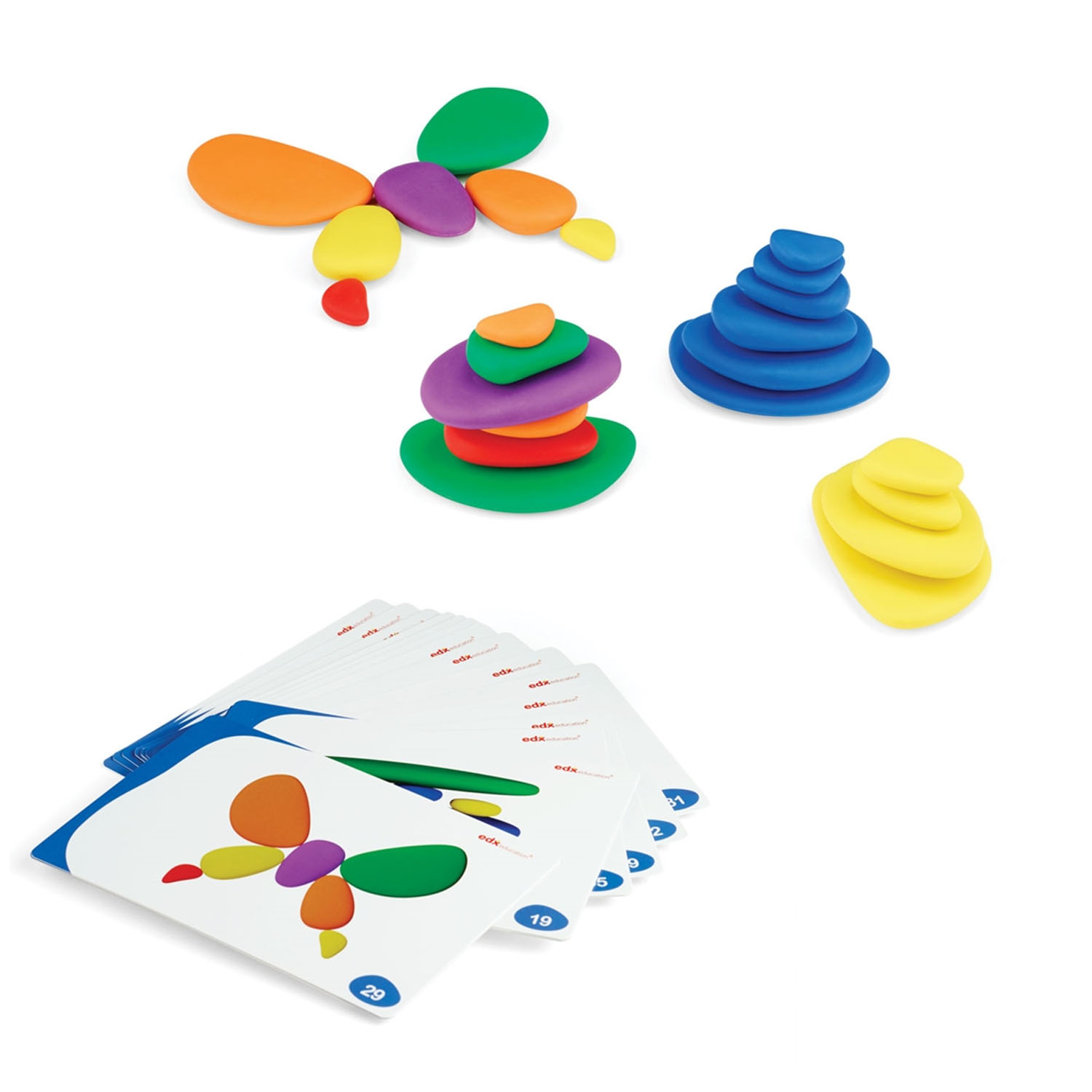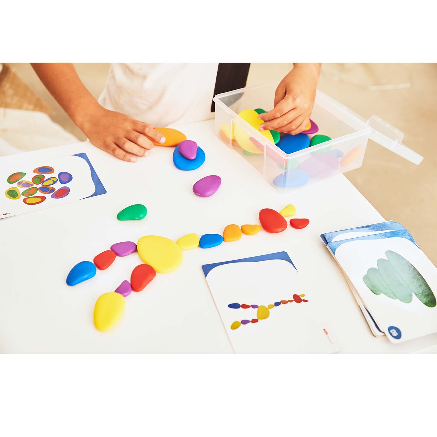 - Set of 36 pebbles (in 6 sizes and 6 colors) and 20 double-sided activity cards in a sturdy plastic container