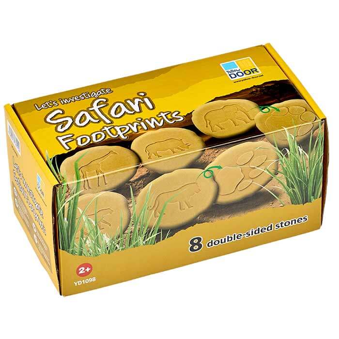 Take a walk on the wild side and explore what animals you might find on the African savanna as you follow their tracks. Each stone has a raised footprint on one side and the related creature in relief on the other. Watch out for the following animals: lion, elephant, rhinoceros, giraffe, hippopotamus, ostrich, cheetah and zebra. The footprint stones can be used in sand, water and soil, and are easily washed clean for a new adventure.