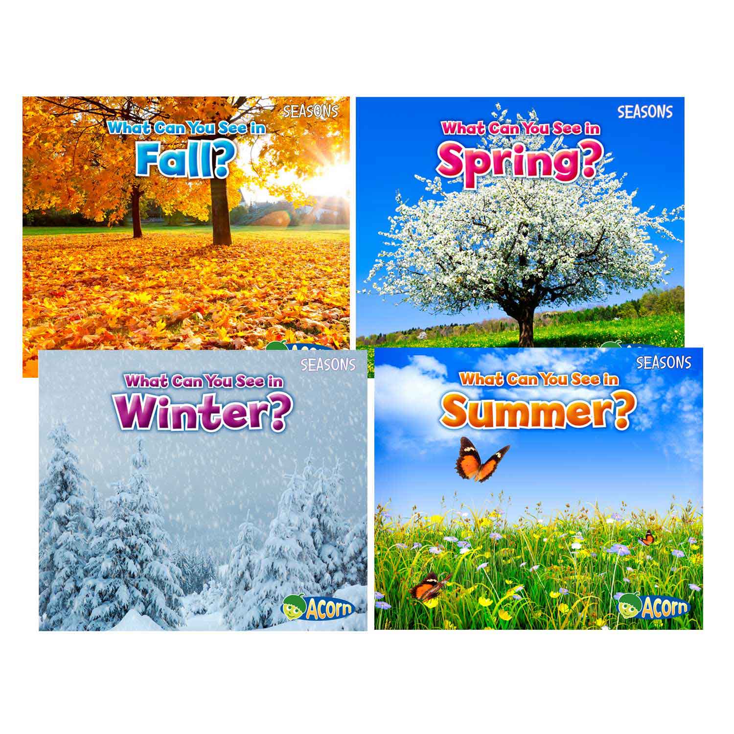 Teach children about all of the seasons in an easy and fun way with the Seasons Book Set. Each of the 4 books in this book set includes beautiful, vibrant photographs of the seasons and simple text to help children to easily understand basic traits and characteristics that match each unique seasons. Each book in this book set also includes stories, puzzles, and activities for skill building.
