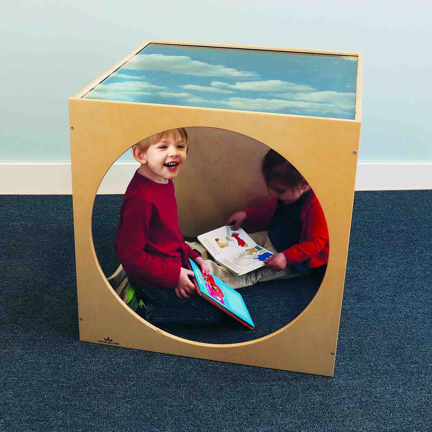 The top of this privacy cube has a shatterproof clear acrylic panel imprinted with a serene sky that invites children inside for a peaceful break while also providing easy visibility for supervision.