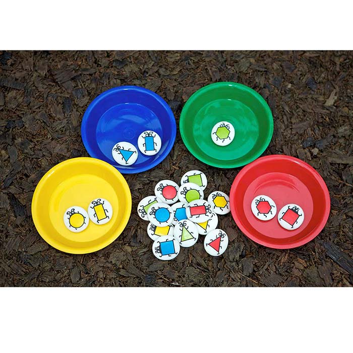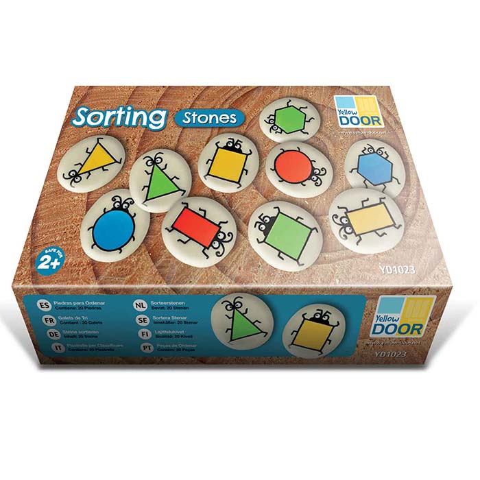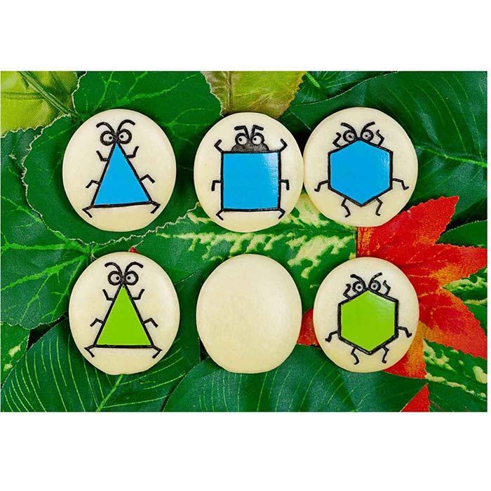Explore color, shape and pattern! Each durable stone has a colorful bug character engraved on one side. Each set includes 20 stones, with five bug body shapes - circle, square, rectangle, triangle and hexagon, in four colors - red, blue, yellow and green. Use tactile sorting stones on land, in sand or water!