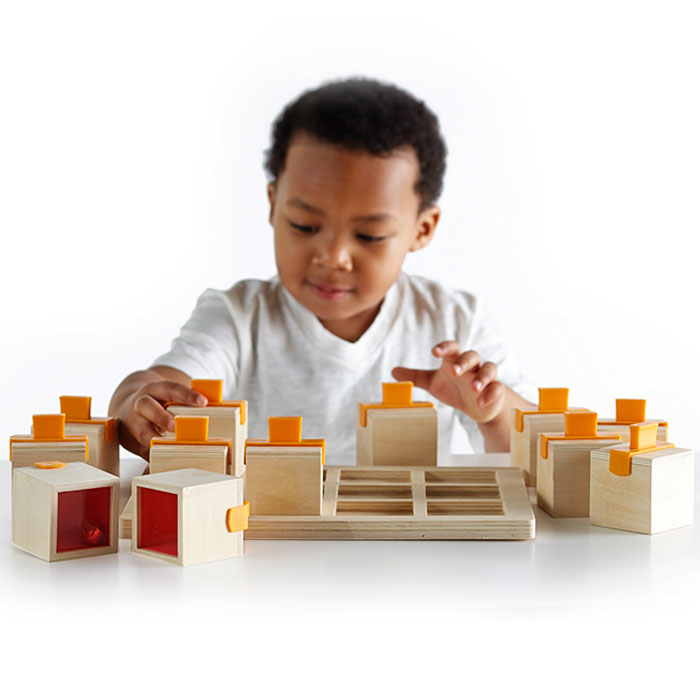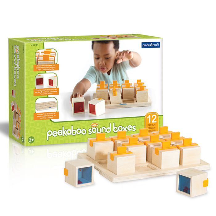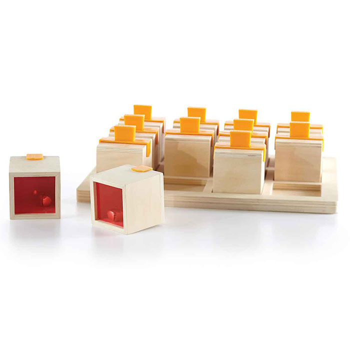 Let's make some noise! Shake the wooden cubes by their sturdy plastic handles to hear each unique rattling sound and then find its match. Look through the translucent colored acrylic on the base of each box to identify the source of the sounds!
