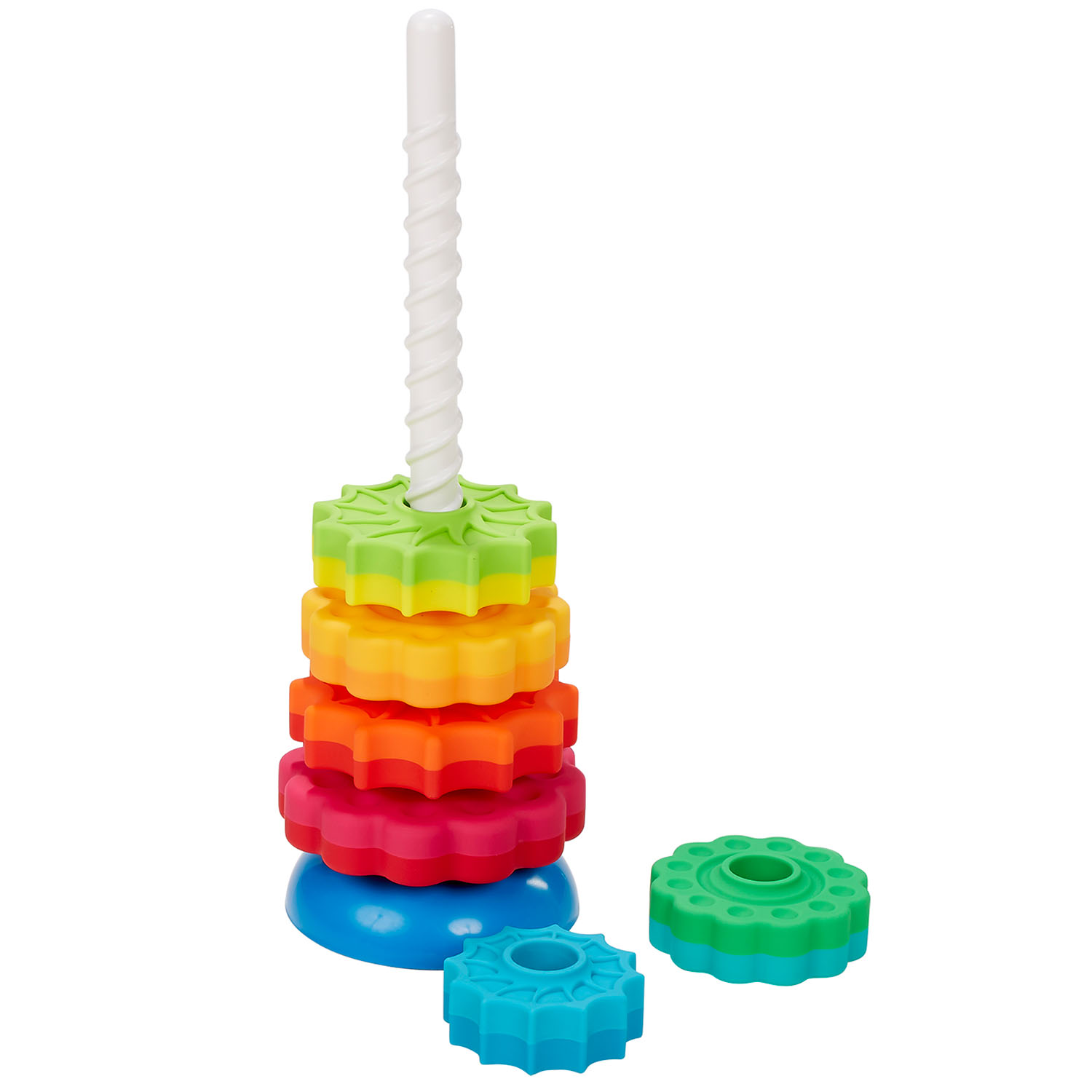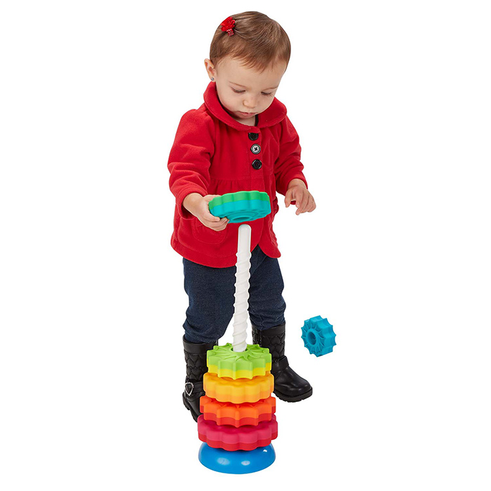 Place the sequentially sizes discs on the corkscrew-shaped rod one at a time and watch with fascination as they spin, twirl, and whirl to the bottom! Each disc is dual-colored, and from largest to smallest, they form a dynamic rainbow utilizing fun shades like magenta, lime, and teal, and your more traditional shades of lemon, red, and sky blue. The star-like discs alternate between daisy style and star-burst shapes, too.