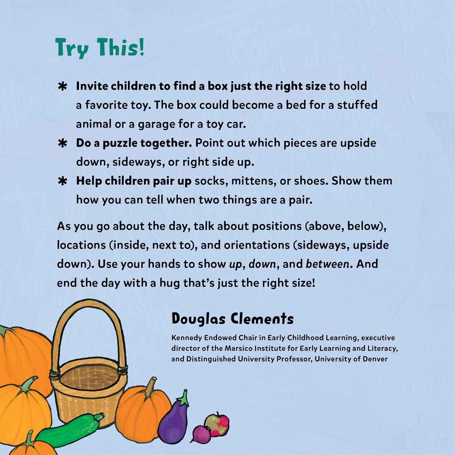 Take a trip to the farmers’ market in this playful story about spatial sense. Olivia is searching for something just the right size to fill her basket. The apple is so small that it rolls around. The zucchini is so long that it sticks out. What will fit just right? View free activities and resources.