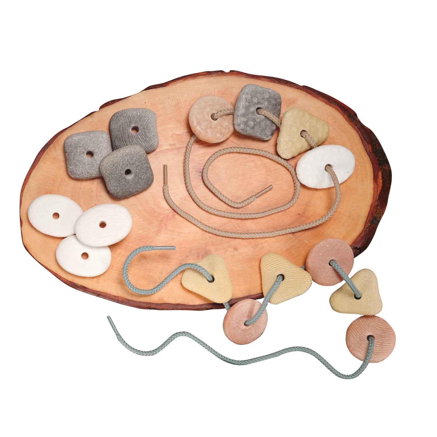 Fine motor meets nature - try threading pebbles! Create patterns by color, shape and texture. Made from a resin and stone mix to feel like real pebbles with added durability.