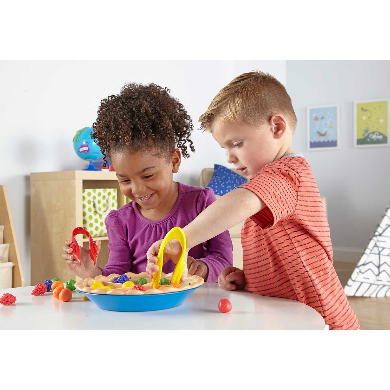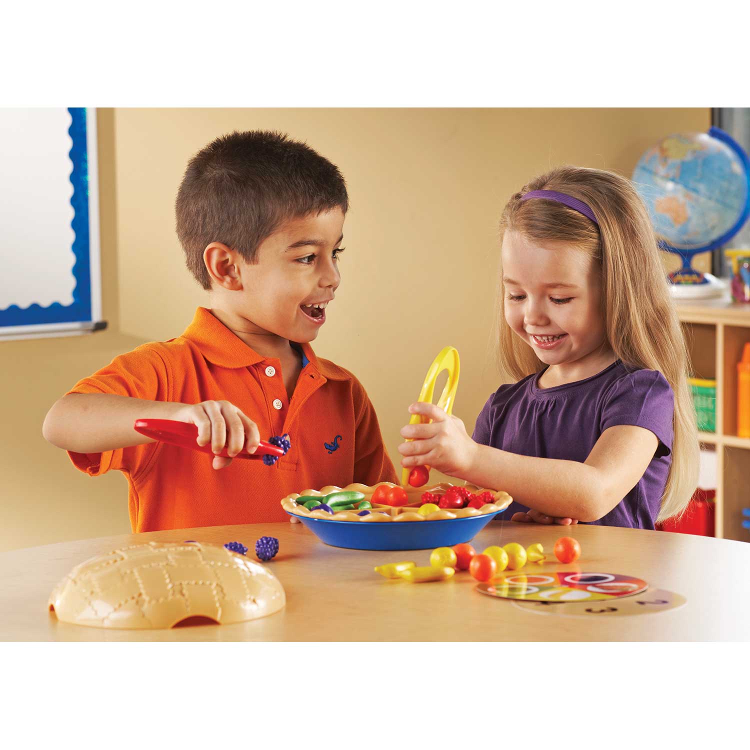 It looks good enough to eat but it's much better as a learning activity! Fruity pie teaches early number skills and attributes including colors and fruit shapes. Children practice fine motor control by using the jumbo tweezers to sort the fruits by different attributes.