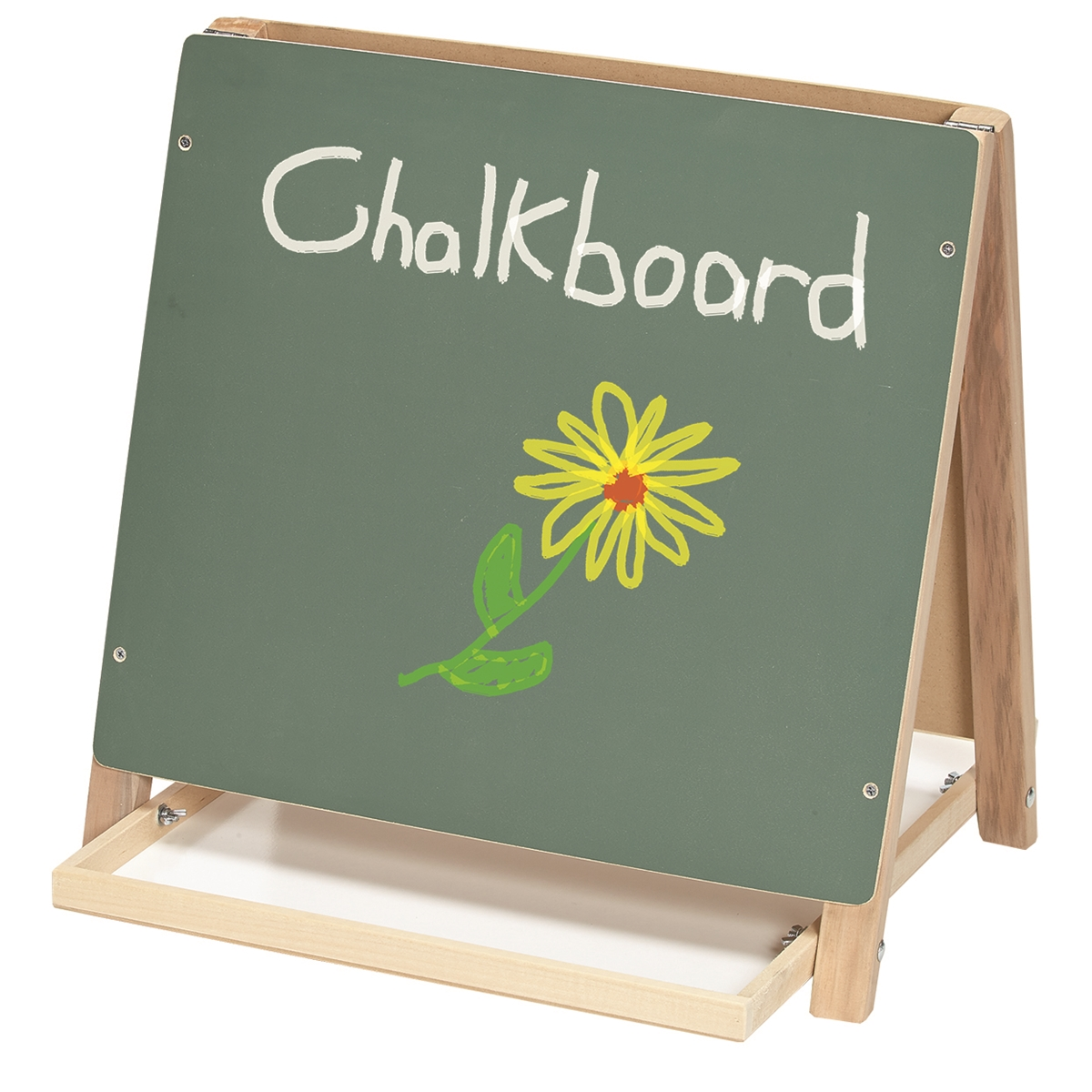 This tabletop easel features a white dry-erase board on one side and a chalkboard on the reverse. Children can write or draw with chalk, markers, crayons, or paint. Large center tray provides added storage space.