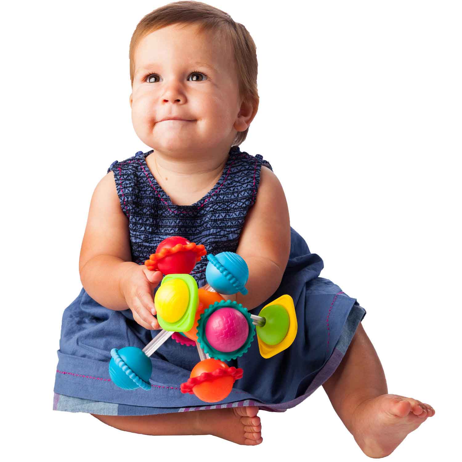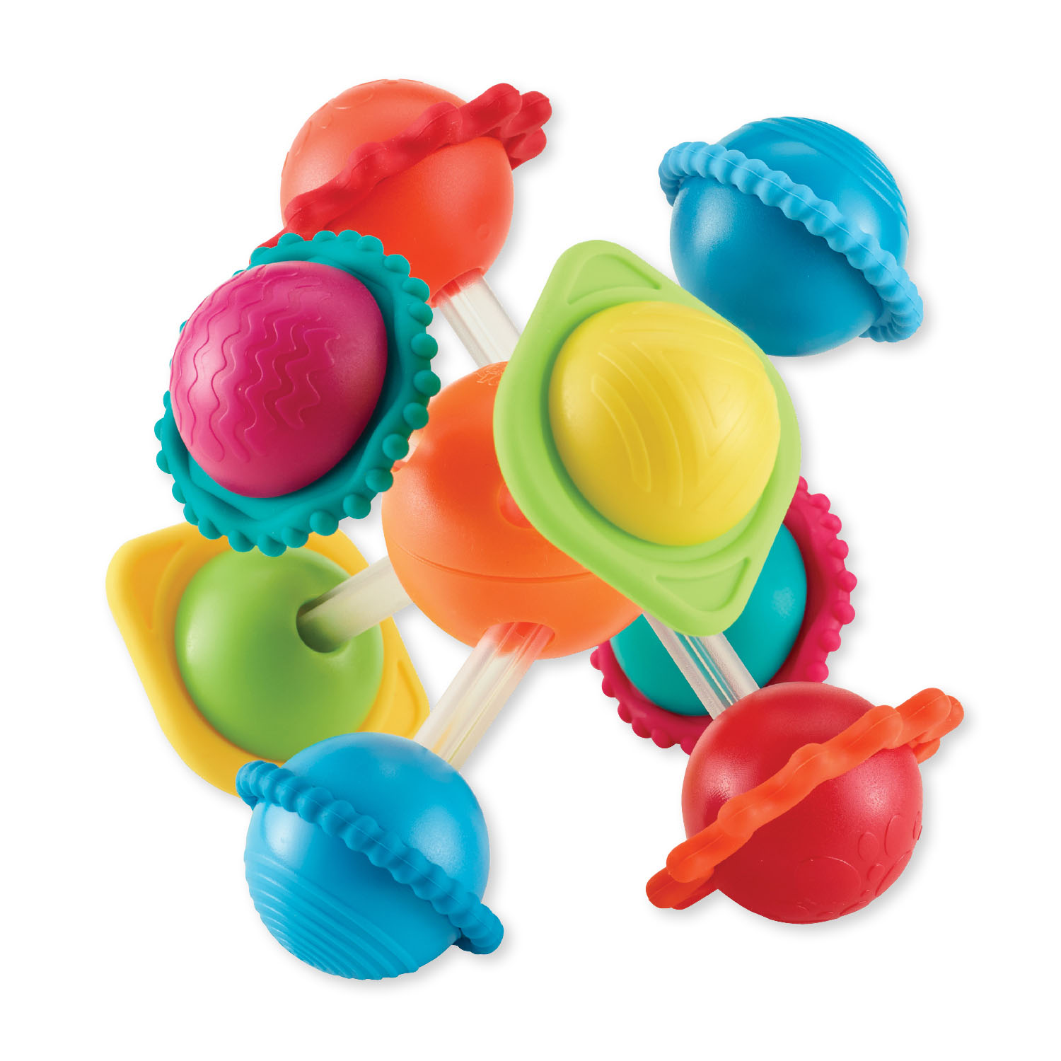 Wimzle is a fun sensory toy for infants and young toddlers. Babies will discover shapes, patterns, balance, and cause and effect! The pieces can be rotated, pushed and pulled but will not come loose. Encourages sensory learning, hand-eye coordination, motor skills, and exploration.